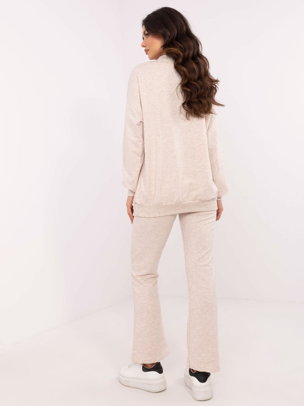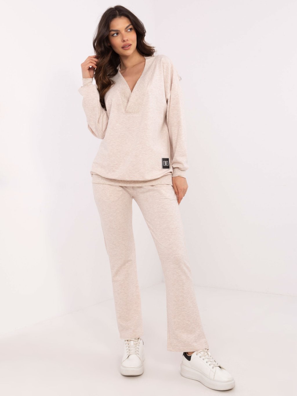 Béžová melanž dámska tepláková súprava s výstrihom do V