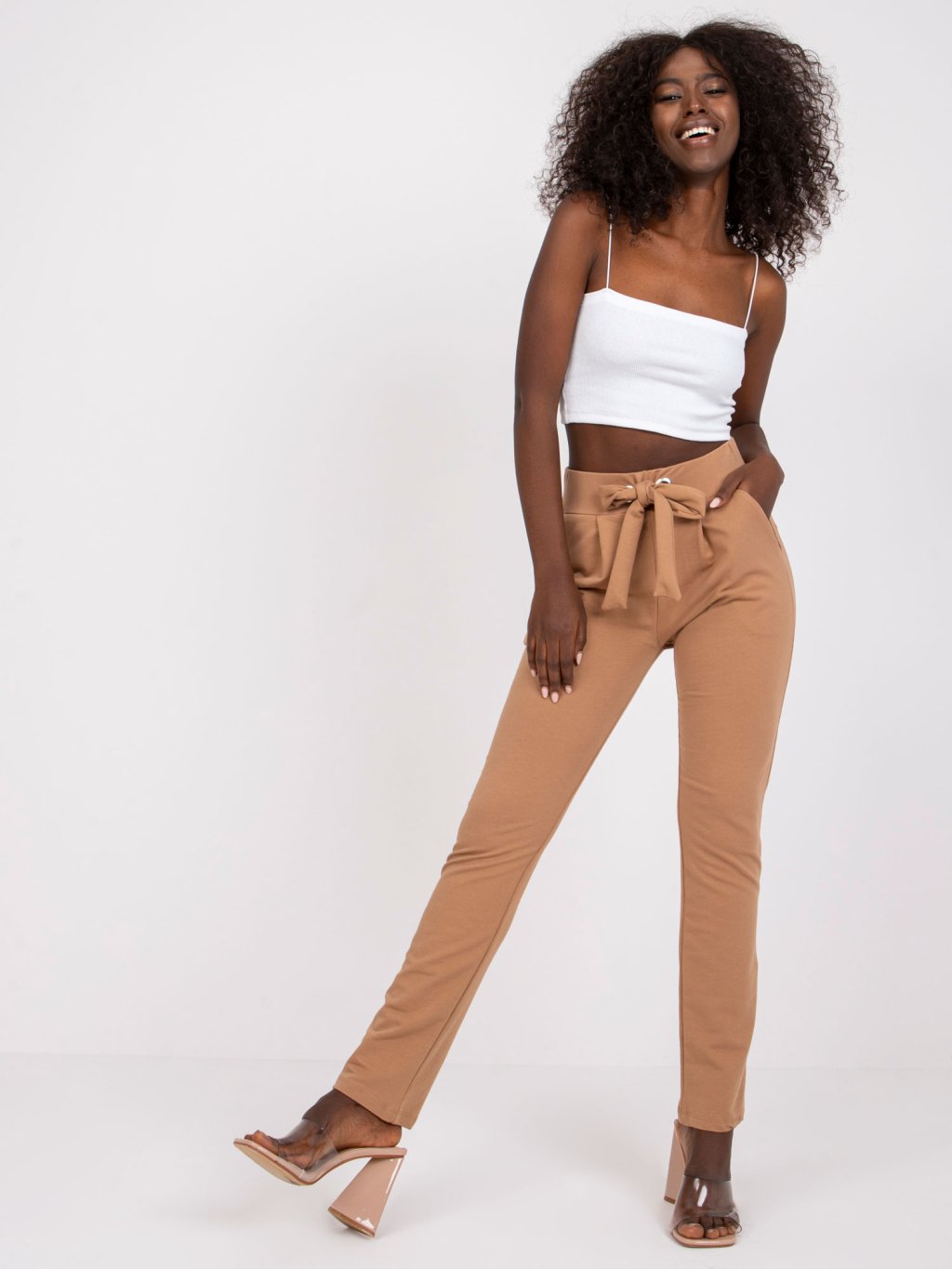 Béžové bavlnené nohavice Santos v páse na mašľu