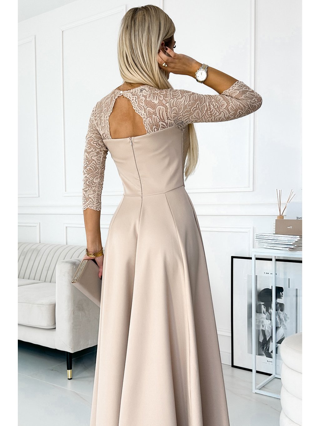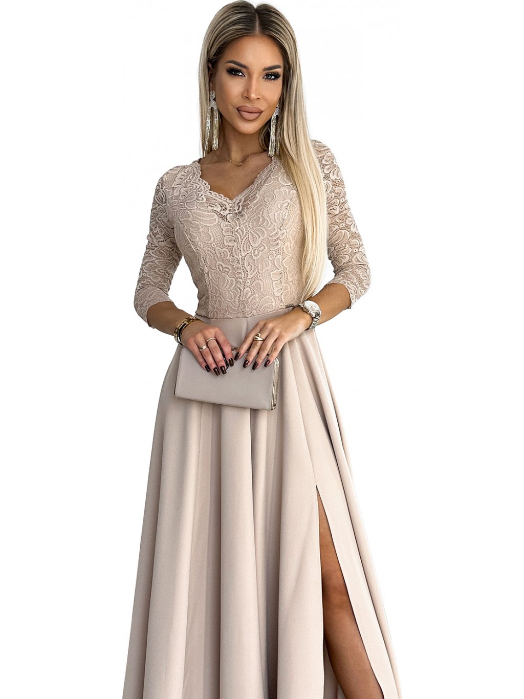 Elegantné béžové čipkové dlhé šaty s výstrihom ELISA
