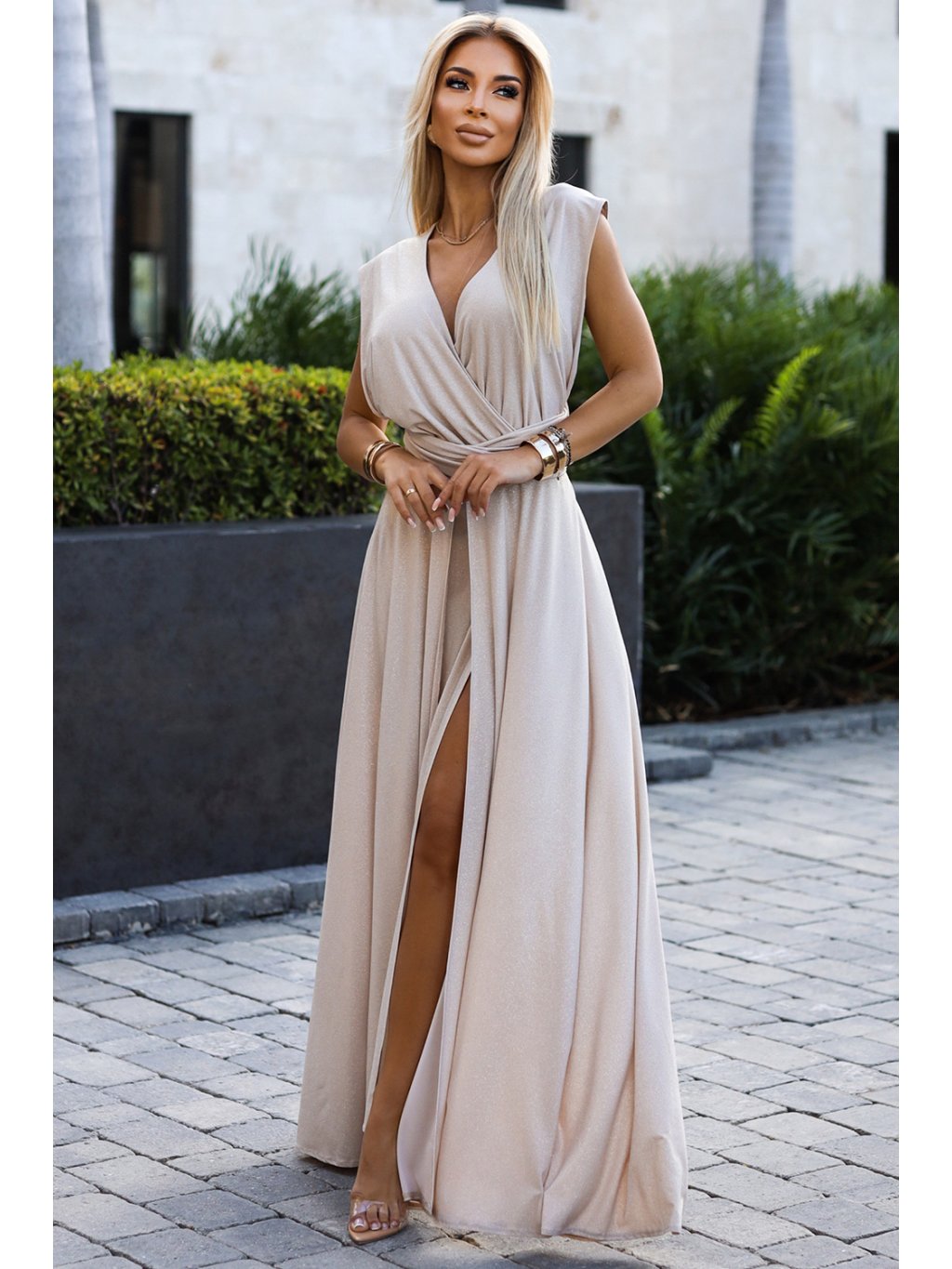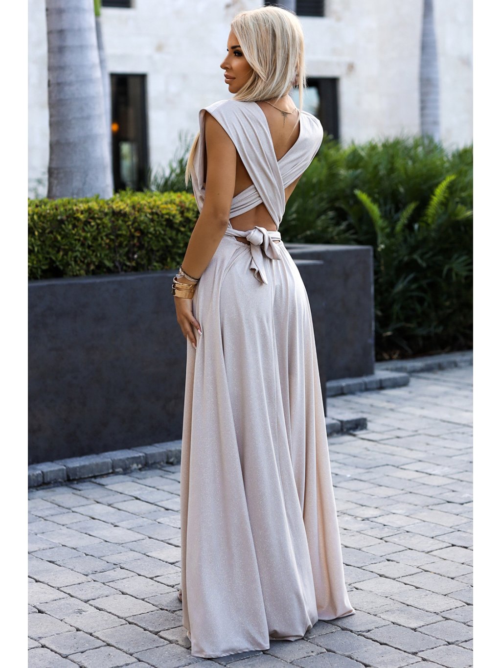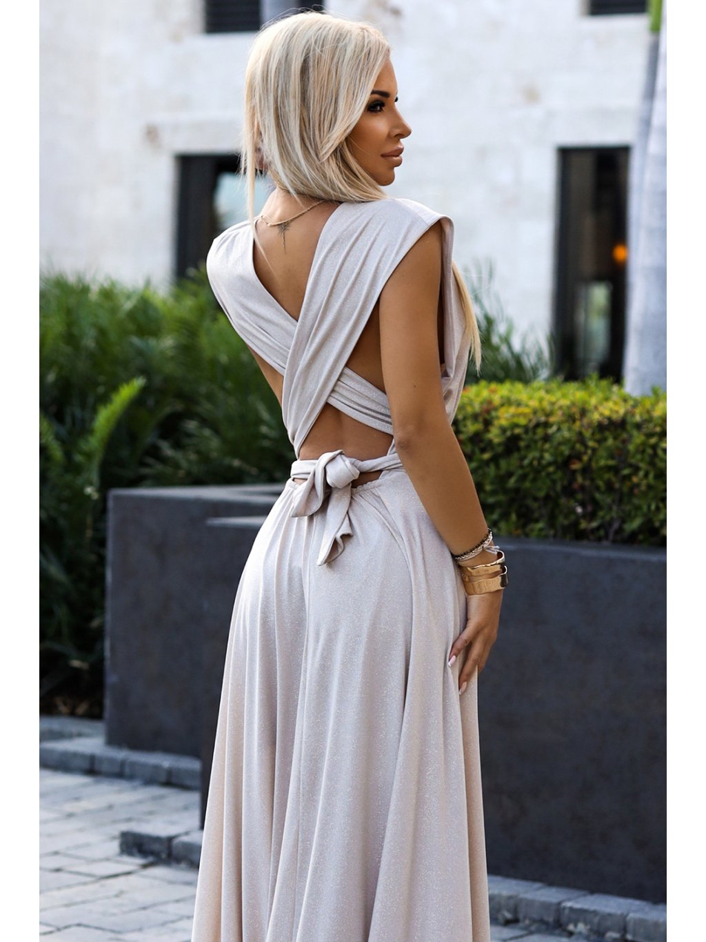 Béžové maxi šaty s viazaním na mnoho spôsobov