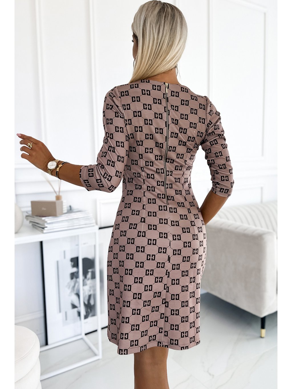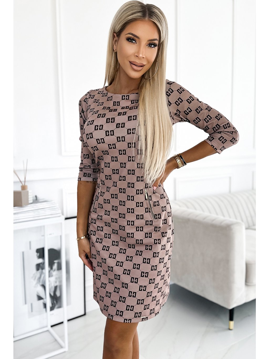 Béžové vzorované šaty so zlatými zipsami MARY