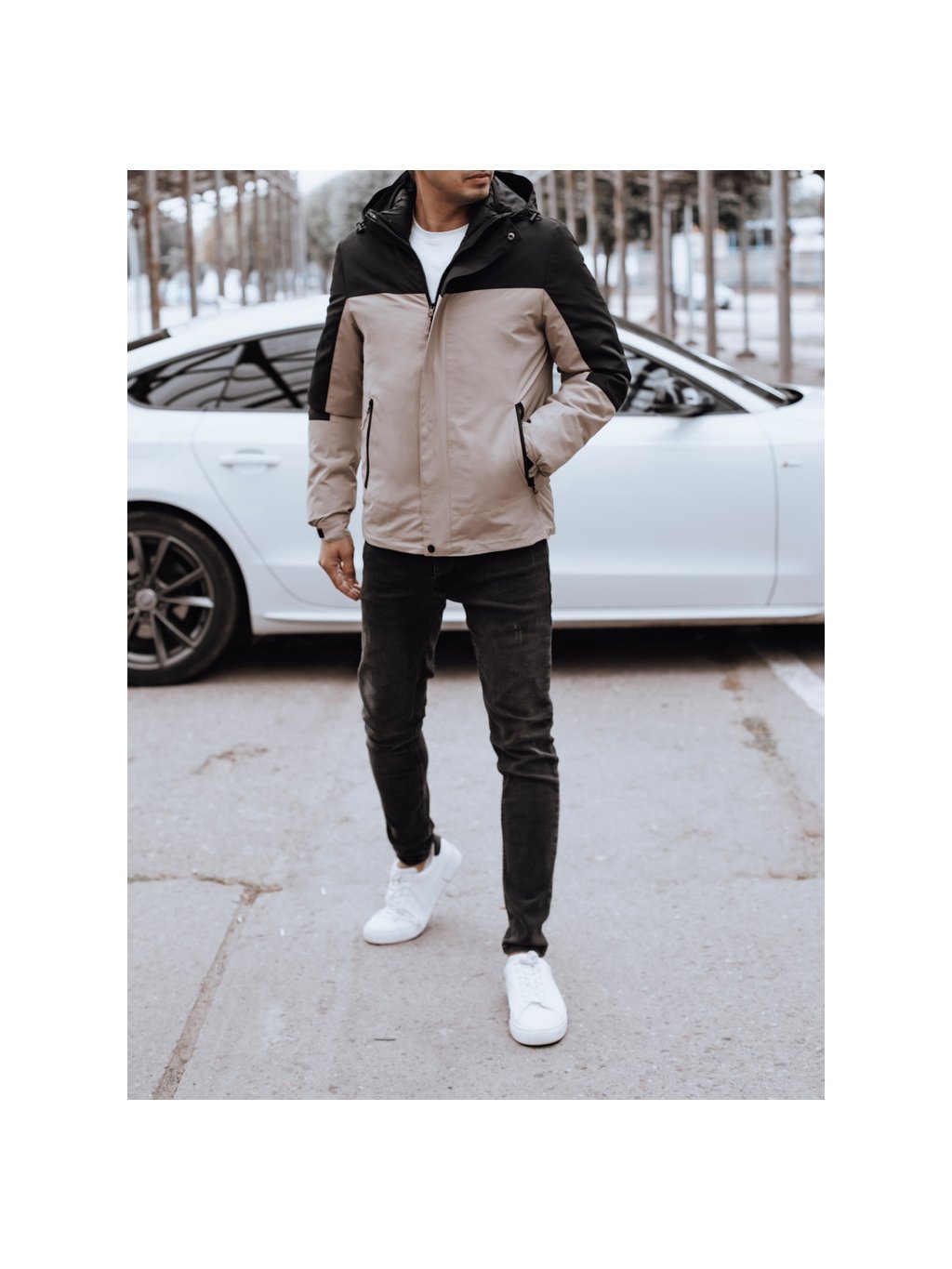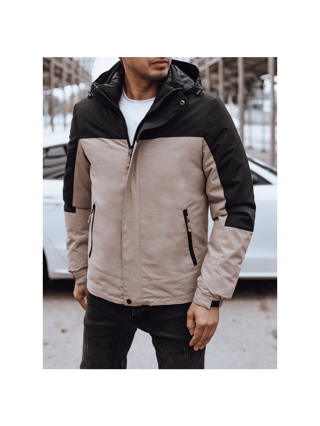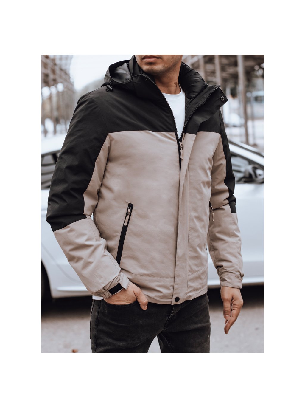 Béžovo-čierna pánska zimná bunda s kapucňou
