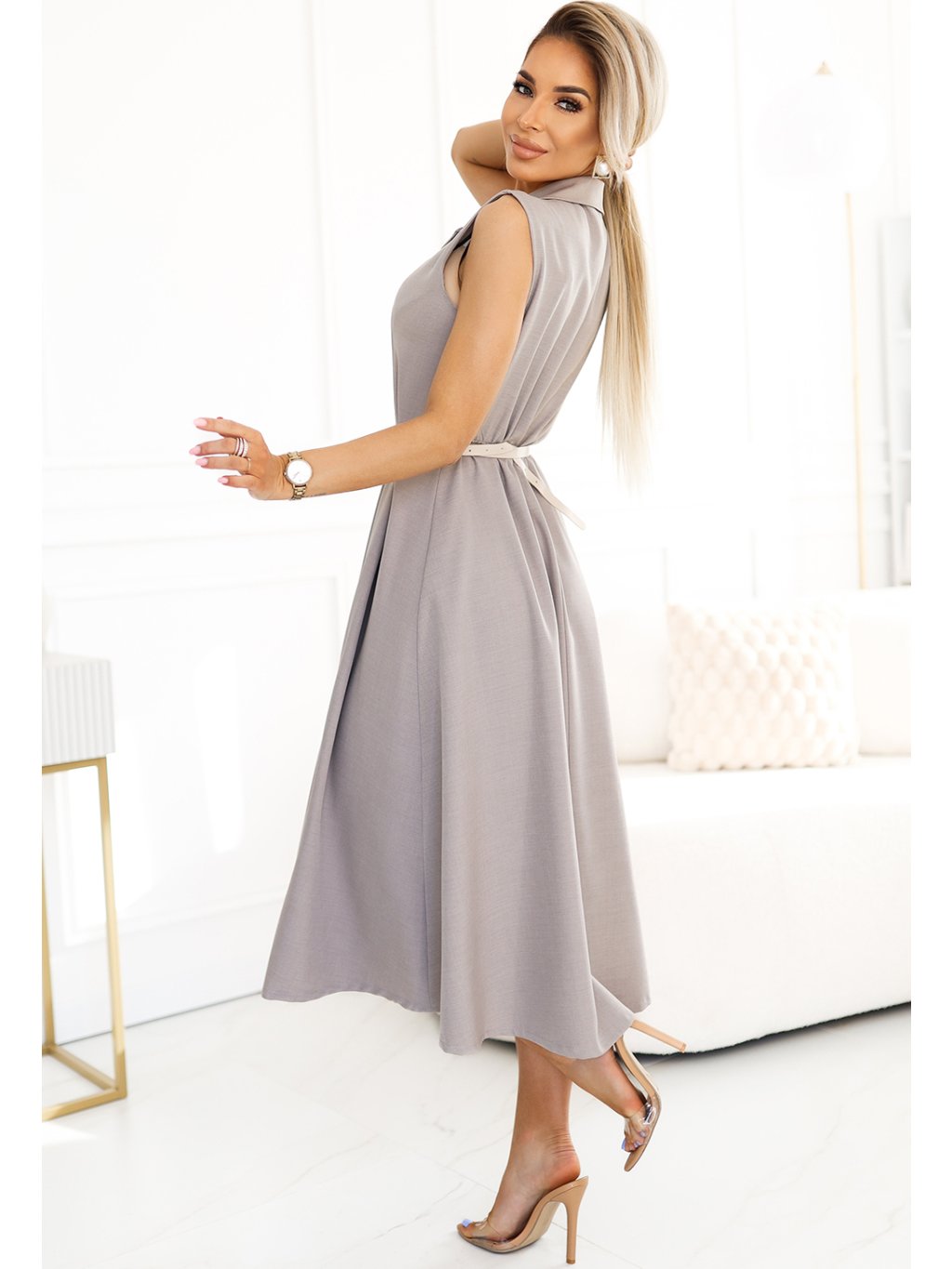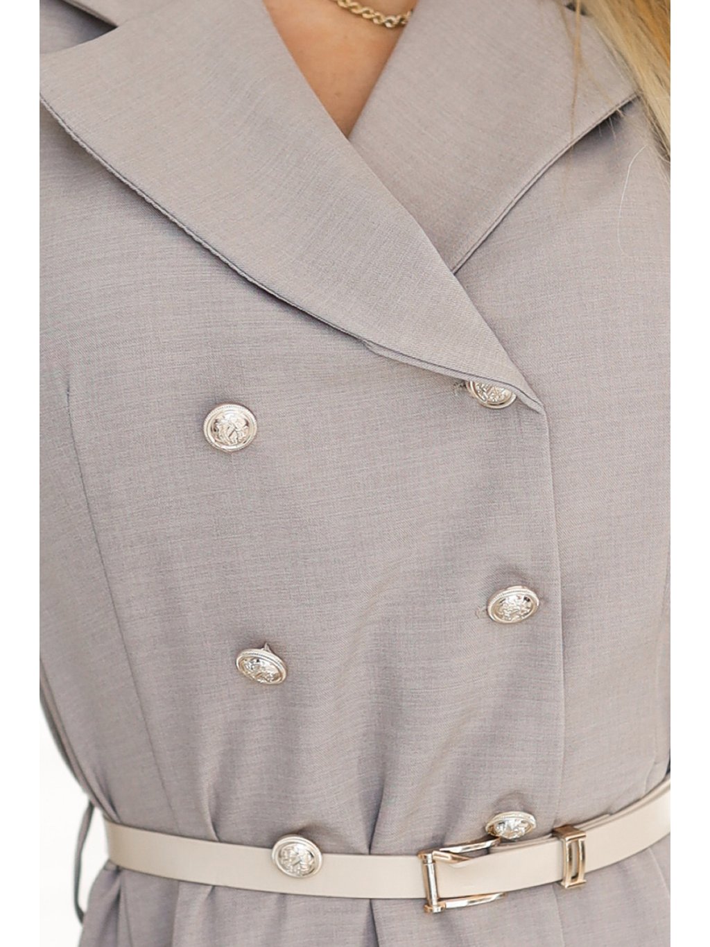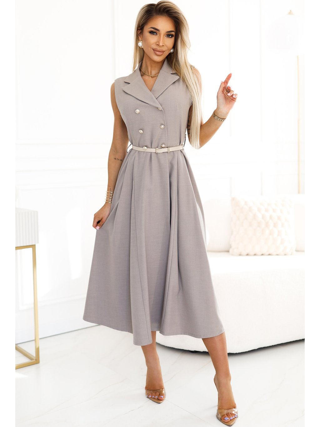 Béžovo sivé dámske elegantné midi košeľové šaty so zlatými gombíkmi a opaskom
