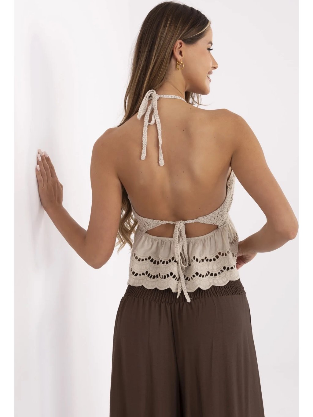 Béžový dámsky prelamovaný boho crop top