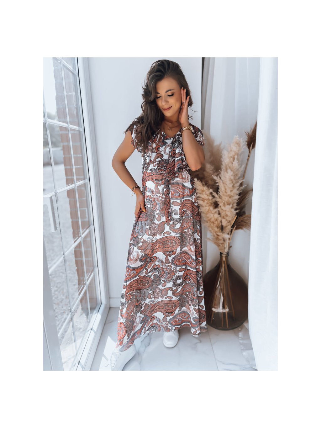 Bielo-hnedé maxi šaty so vzorom CRESPO