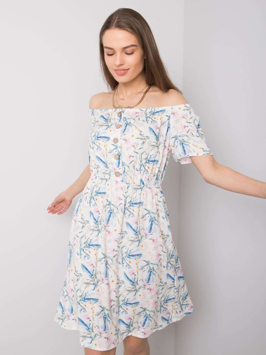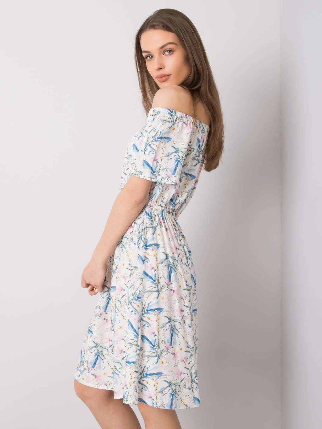 Bielo-modré dámske kvetinové šaty s odhalenými ramenami
