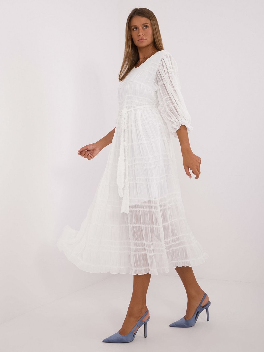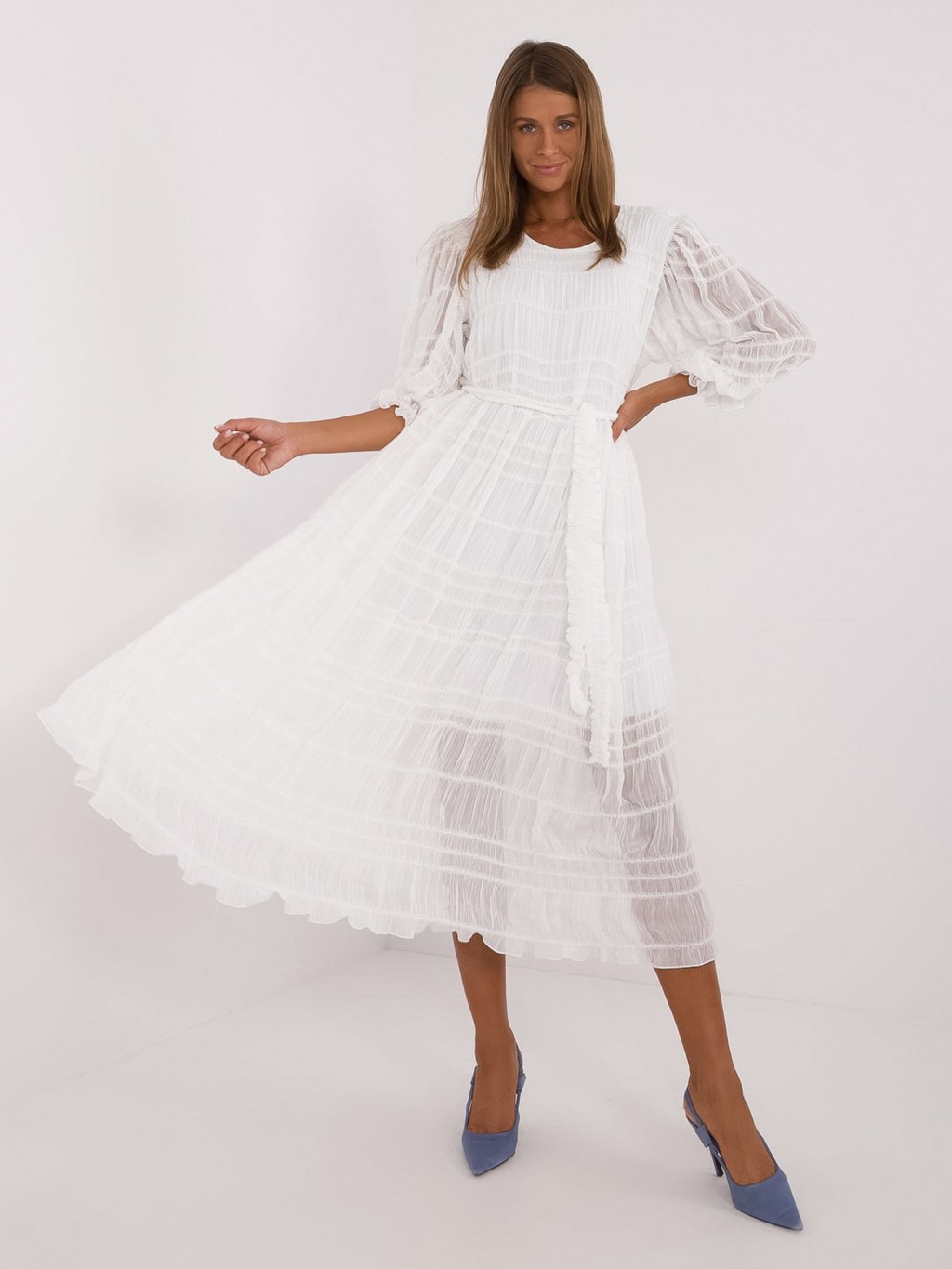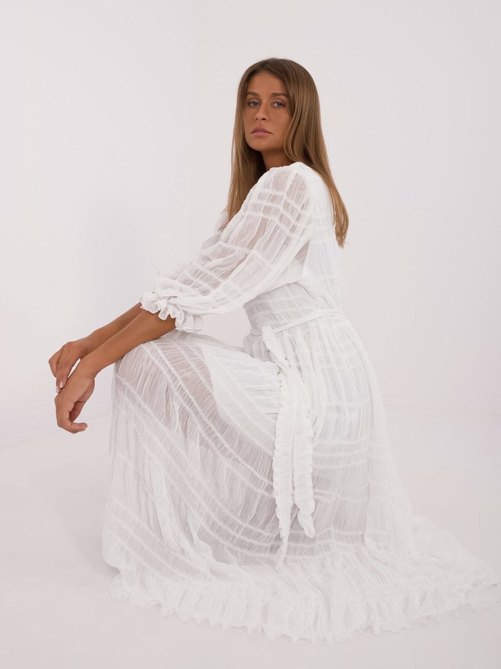 Modelka na obrázkoch je vysoká 176 cm, obvod cez prsia má 85 cm, obvod pása 64 cm a boky 92 cm.