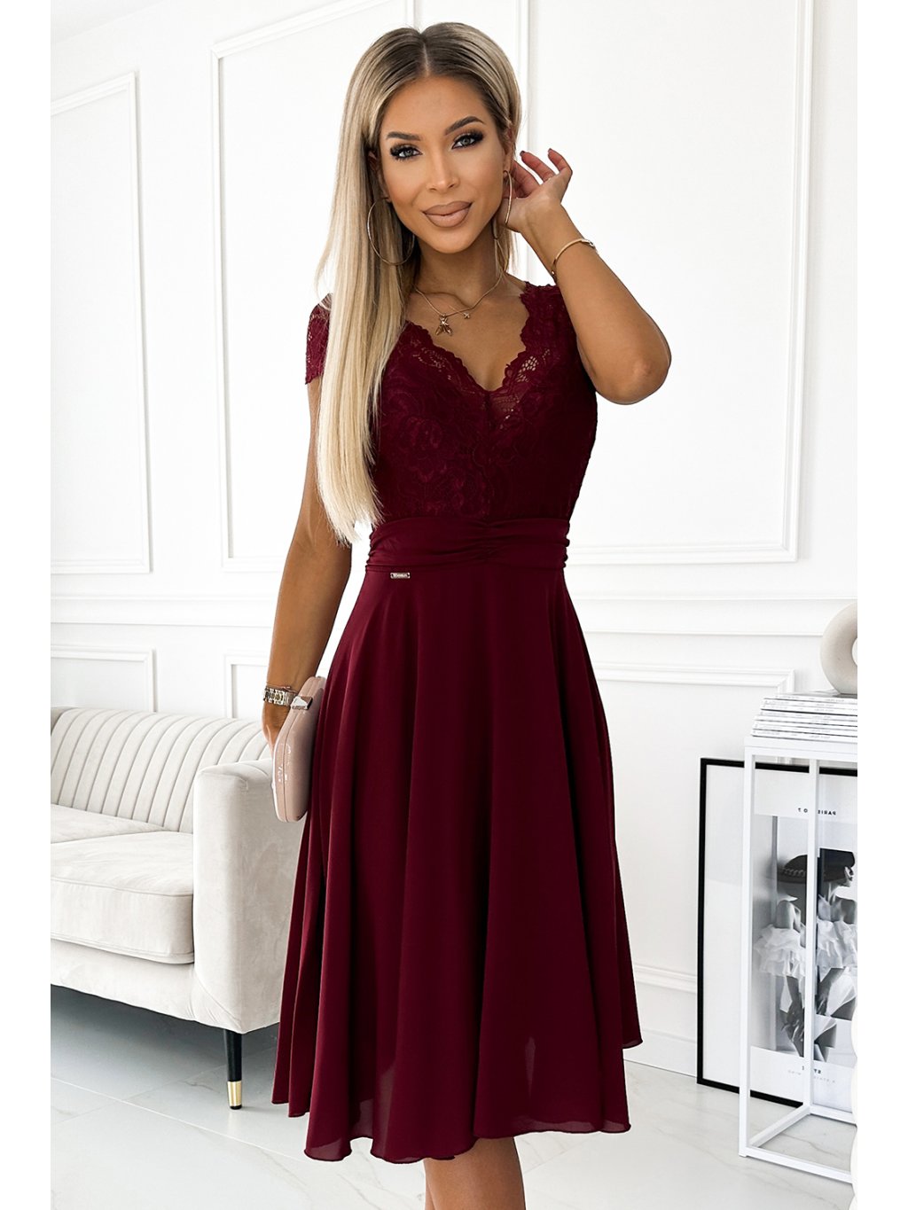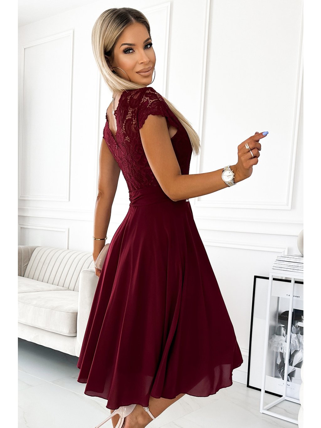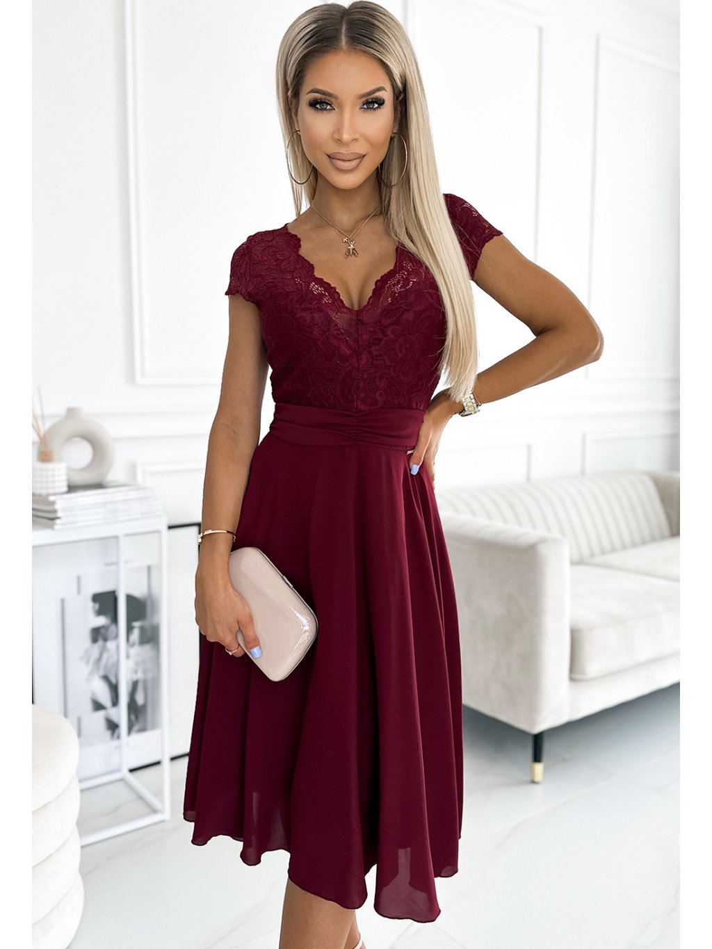 Bordó šifónové šaty s čipkovým výstrihom ALEXIS