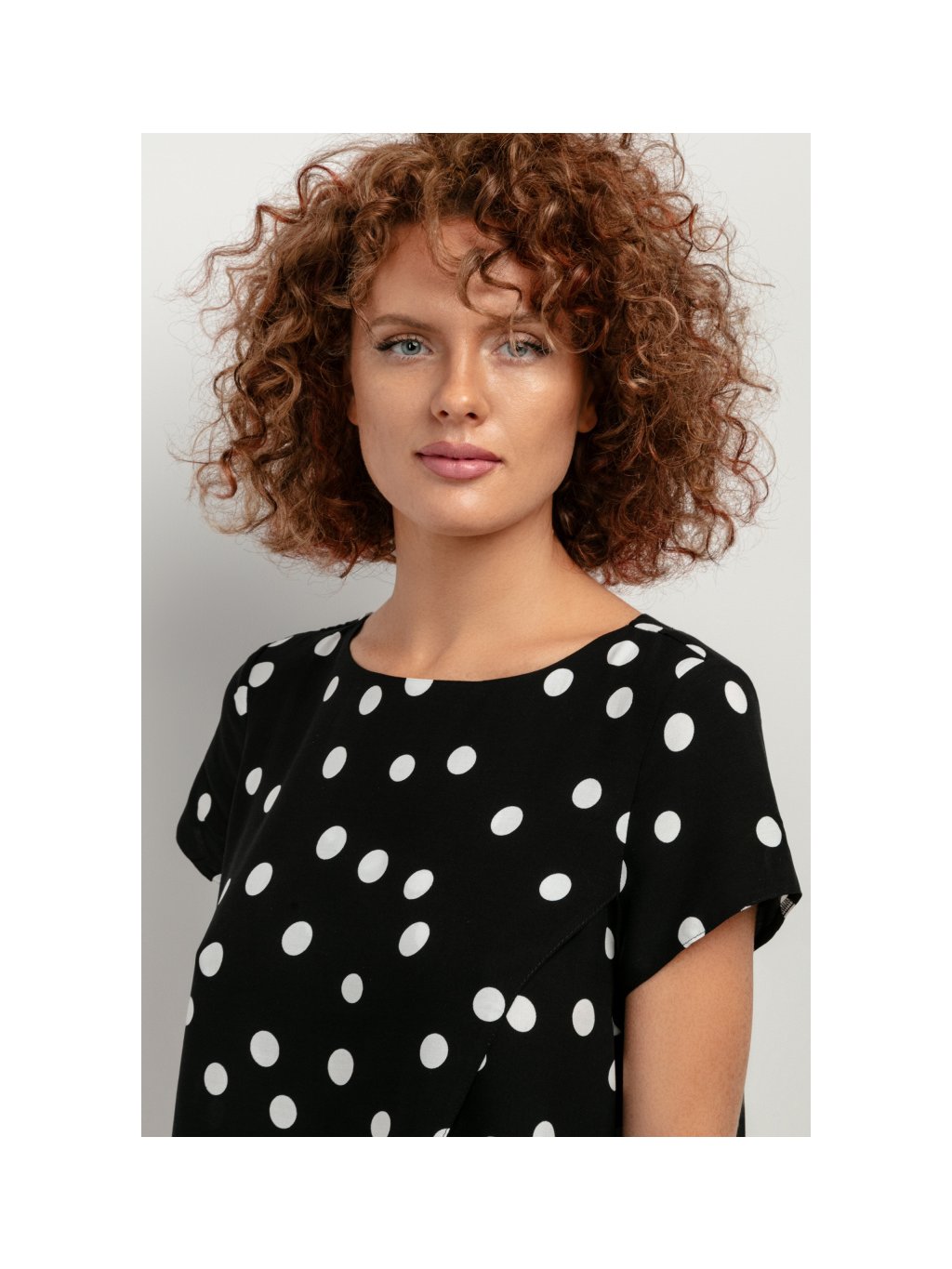 Čierna dámska blúzka s asymetrickým strihom a bielymi bodkami
