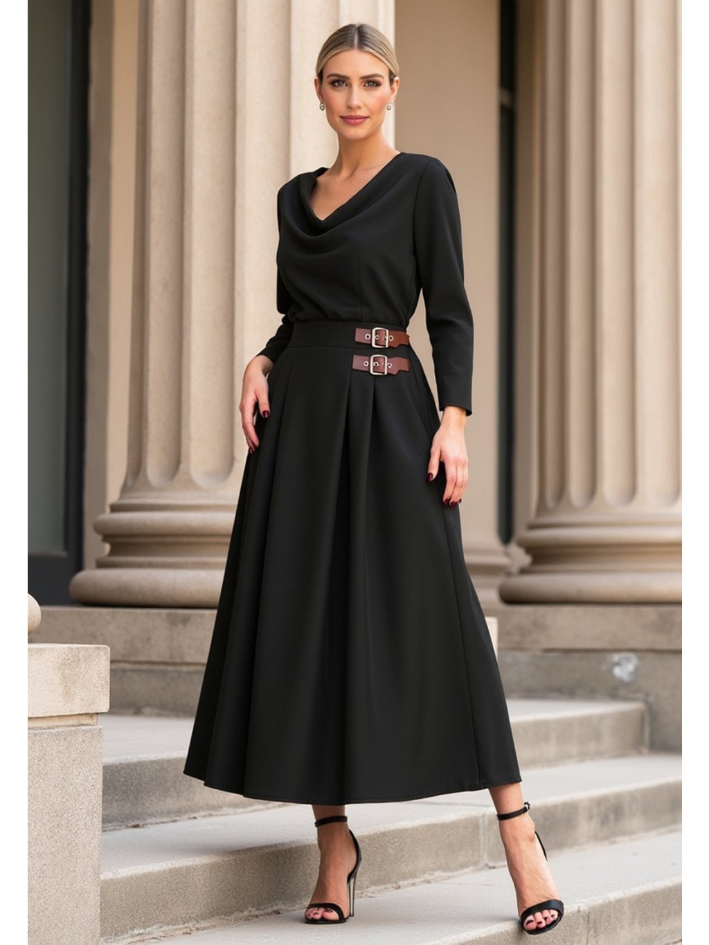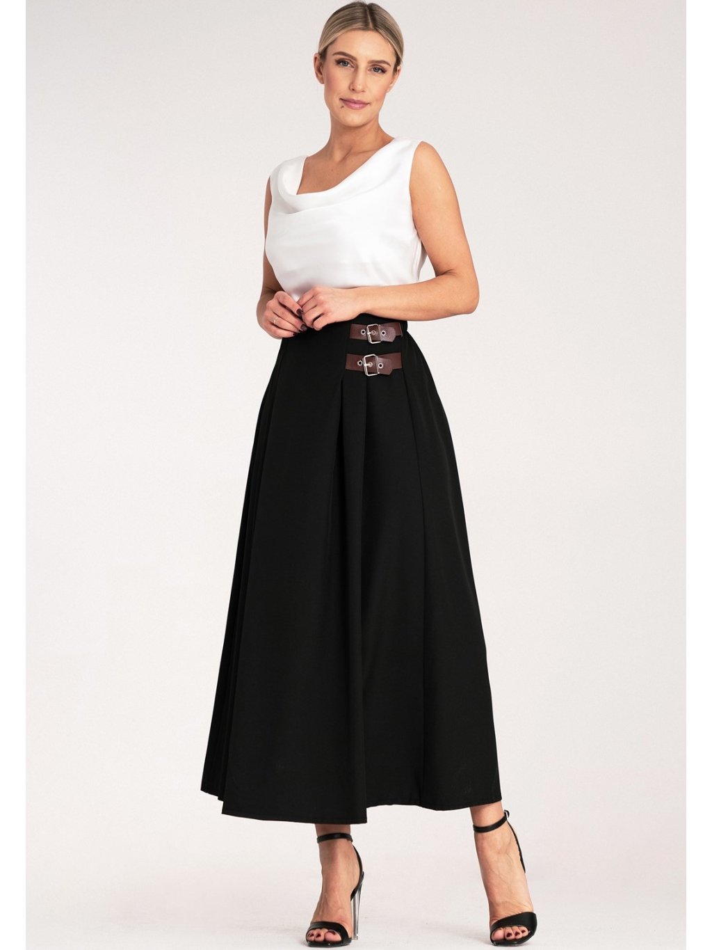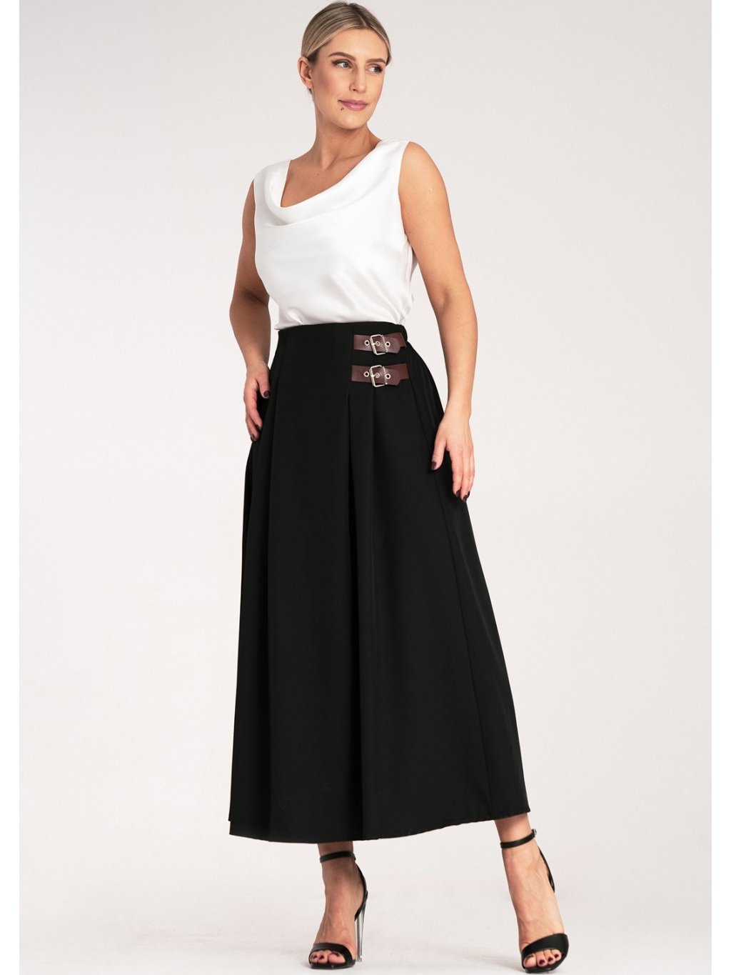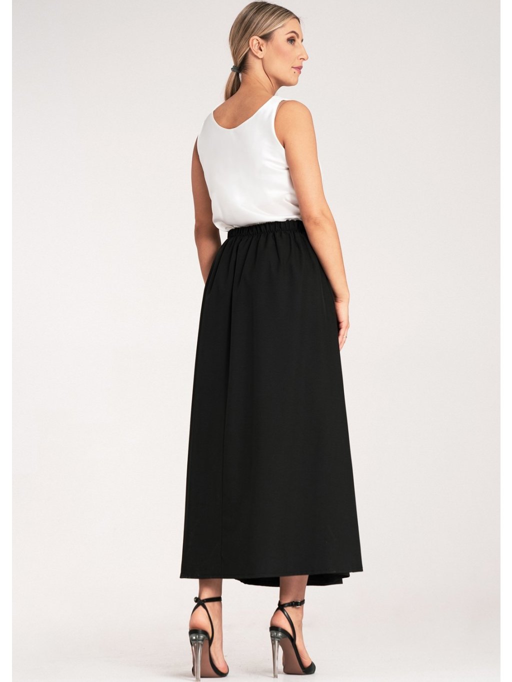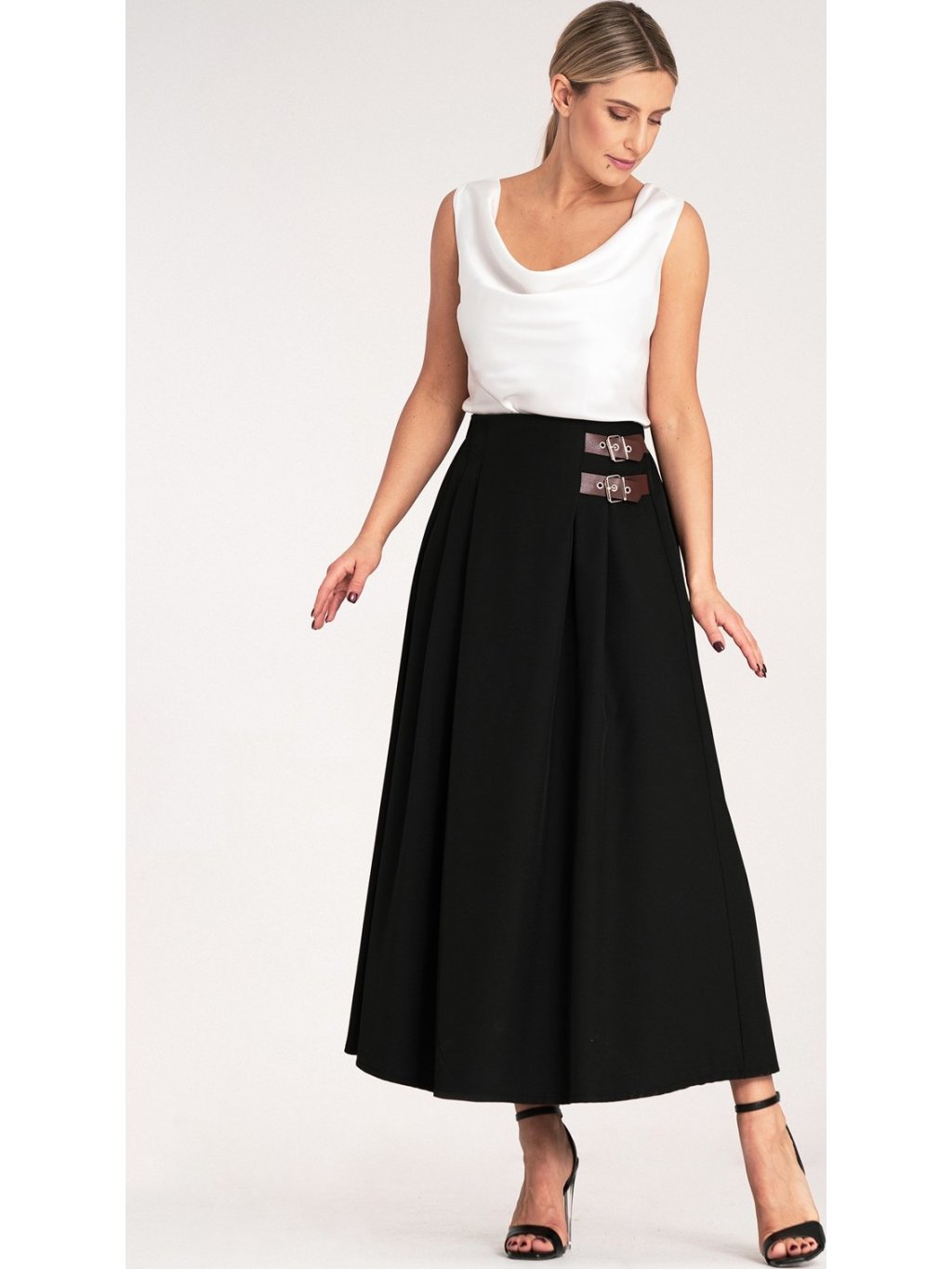 Čierna dámska elegantná midi sukňa s bočnými pásikmi a prackami