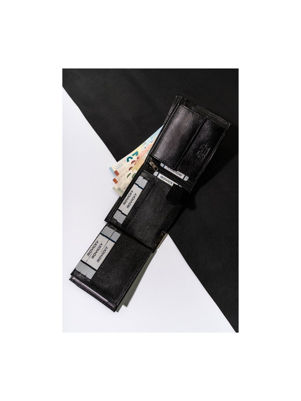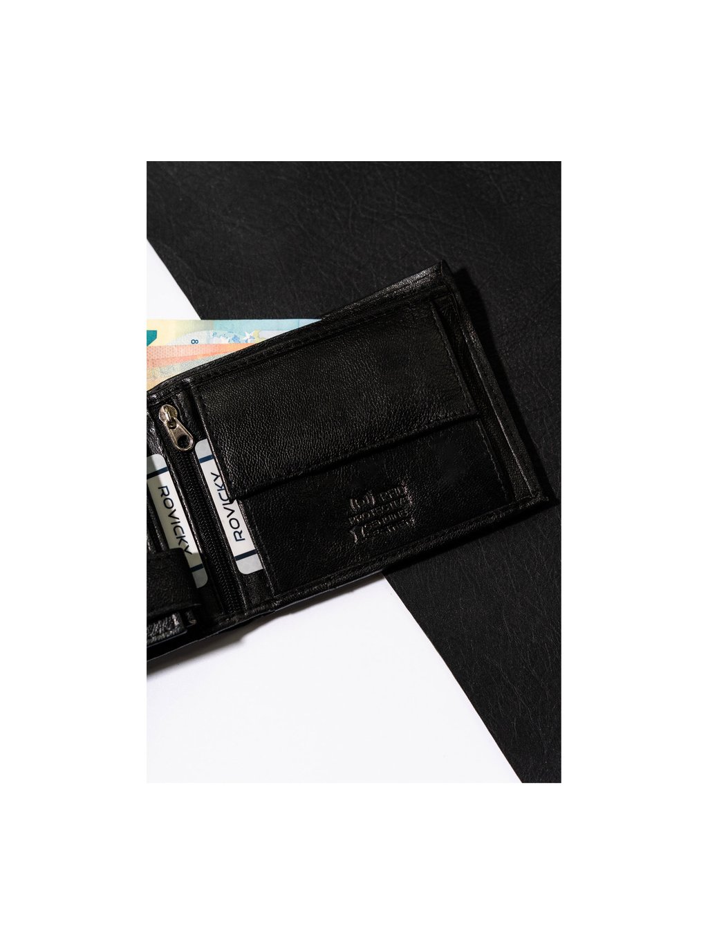 - 1 priehradka na zips, všitá v strednej časti peňaženky