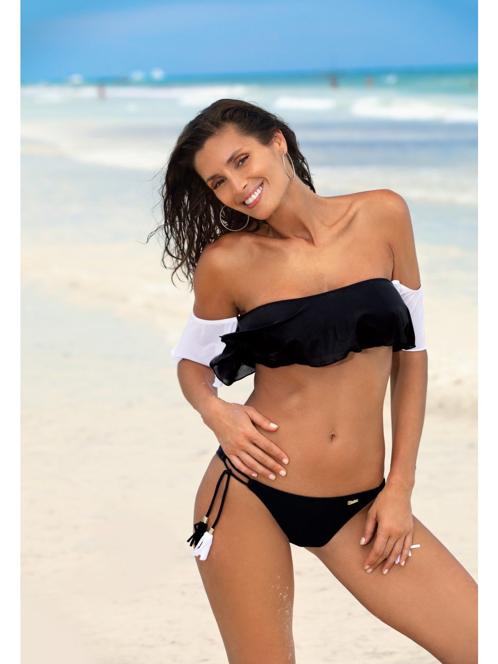 Čierne bikiny s bielymi volánikmi a strapcami Elena Nero-Bianco
