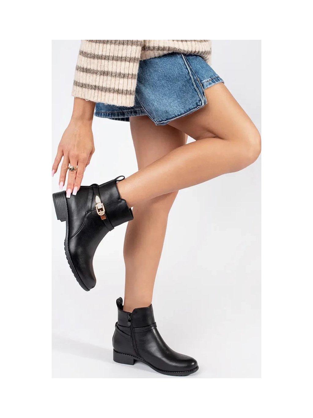 Čierne členkové dámske topánky na nízkom podpätku s ozdobným pásikom