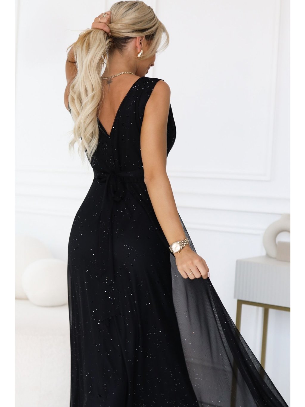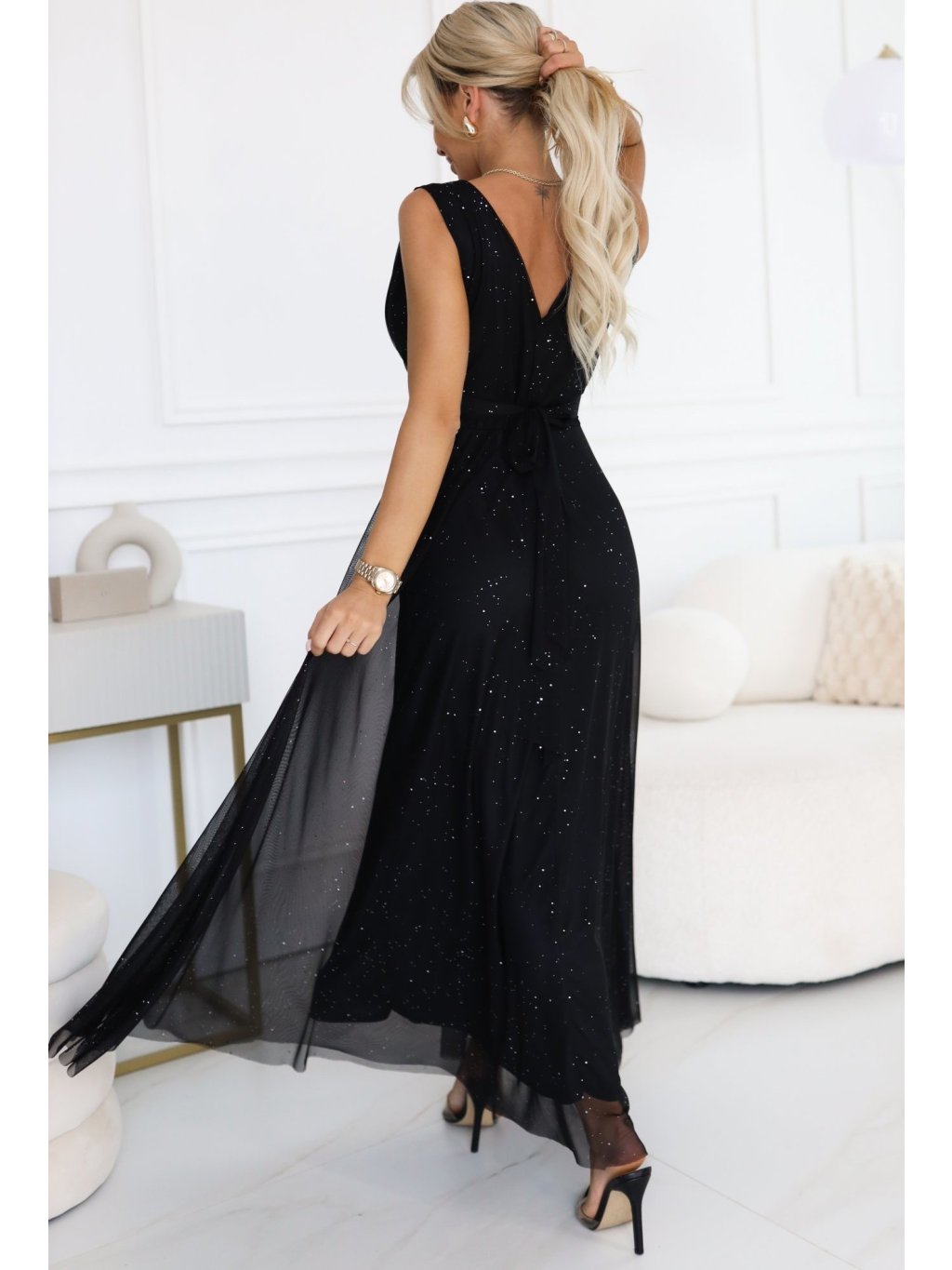 Čierne dlhé večerné trblietavé šaty s hlbokým výstrihom