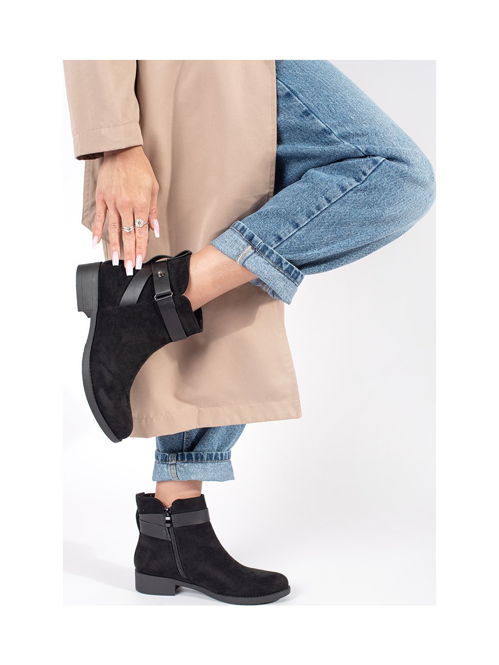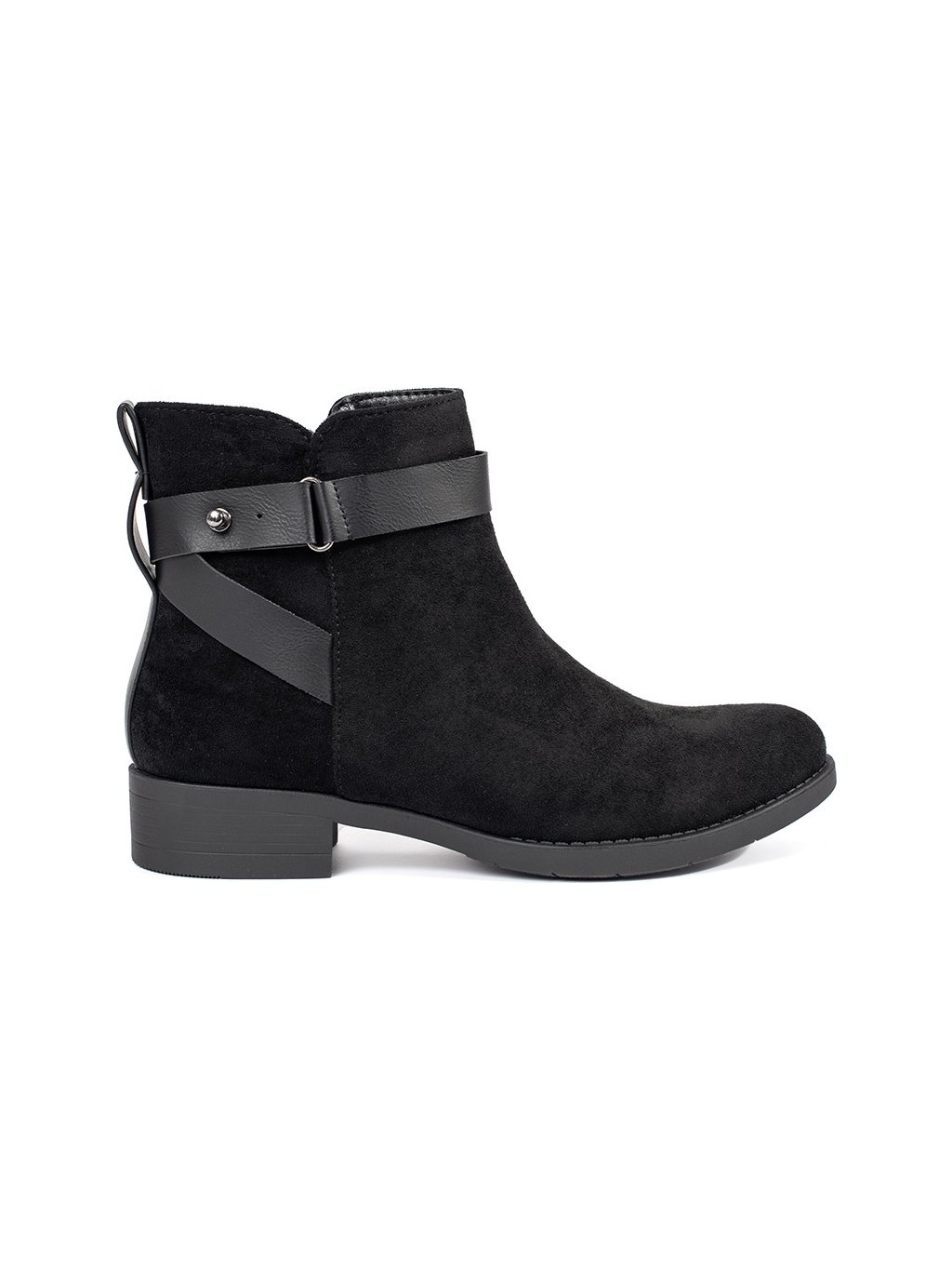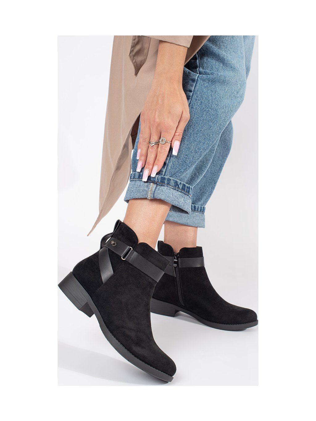 Čierne semišové dámske členkové topánky s ozdobným pásikom, podpätok 3 cm