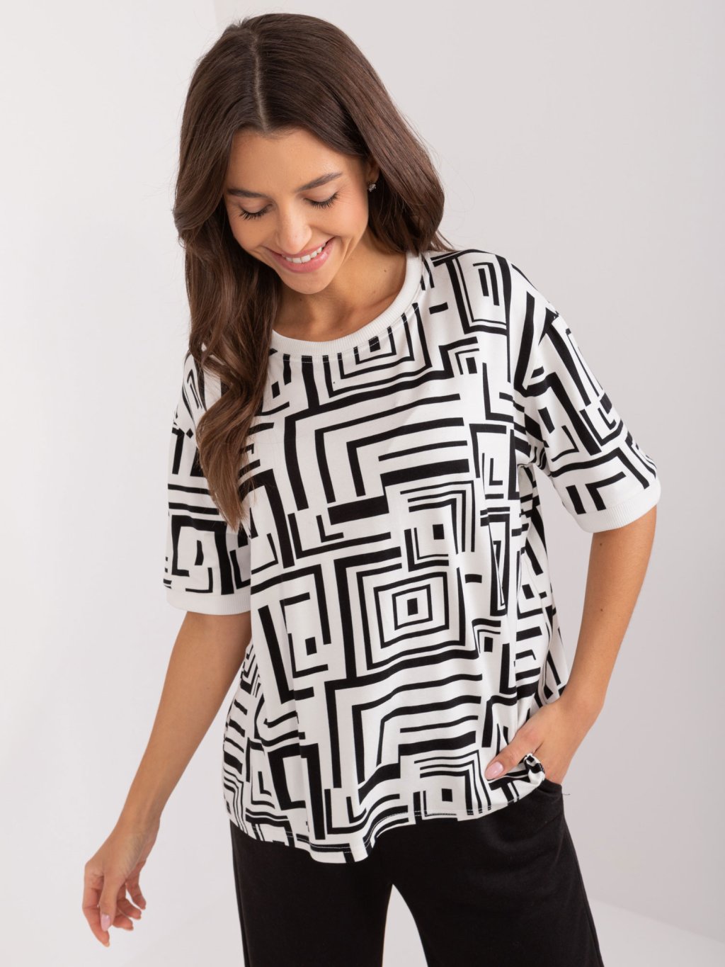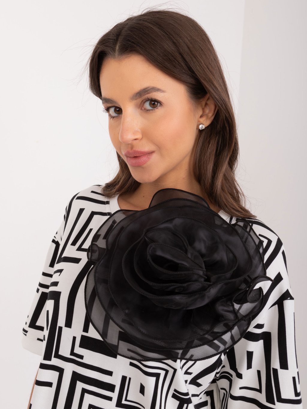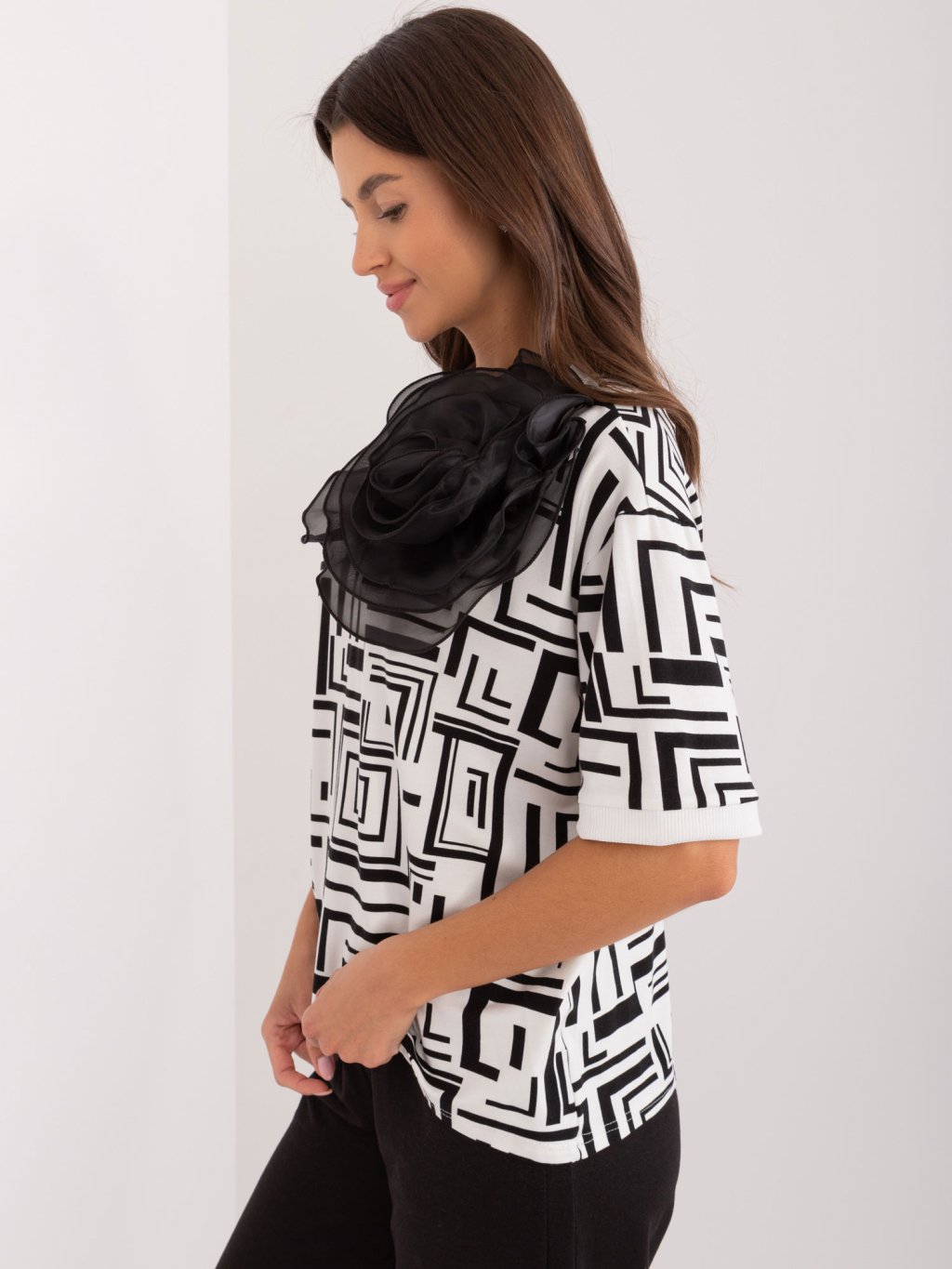 Čierno-smotanová elegantná blúzka s geometrickým vzorom a kvetinovou brošňou
