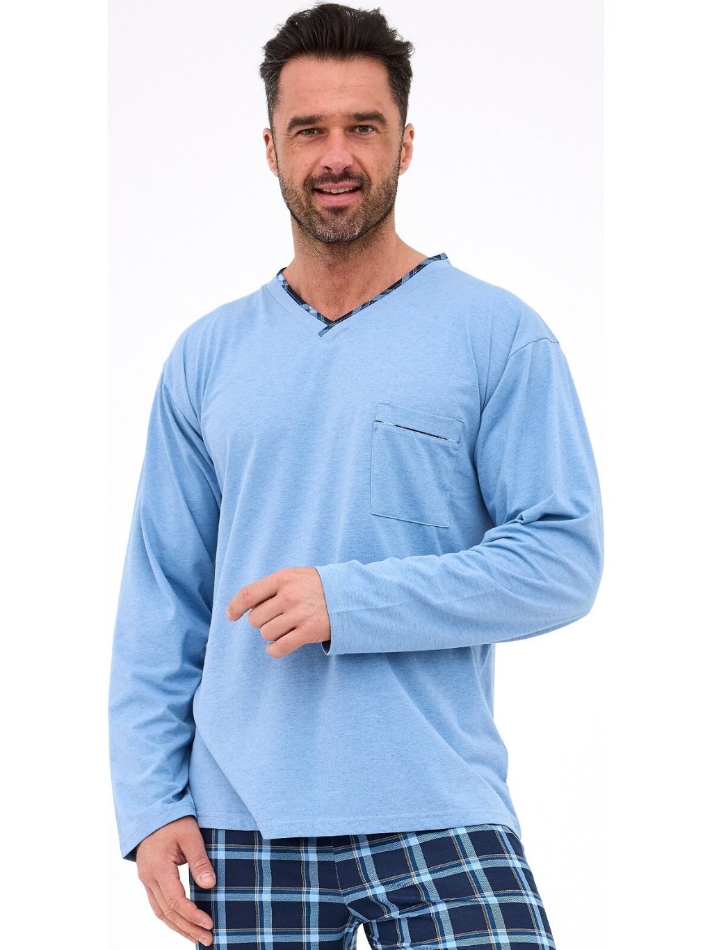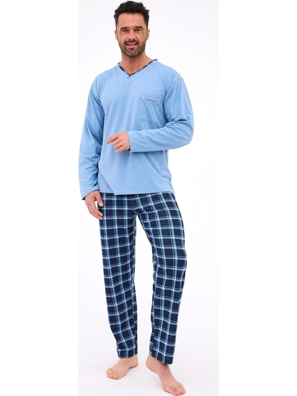 Cornette Modré pánske dlhé pyžamo s károvanými nohavicami