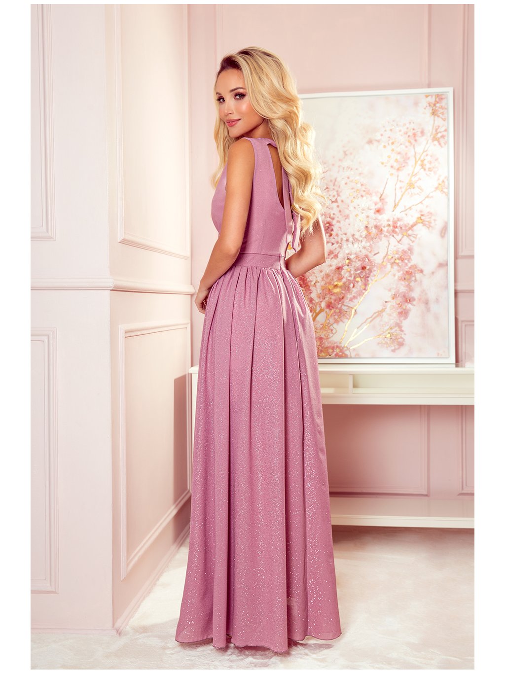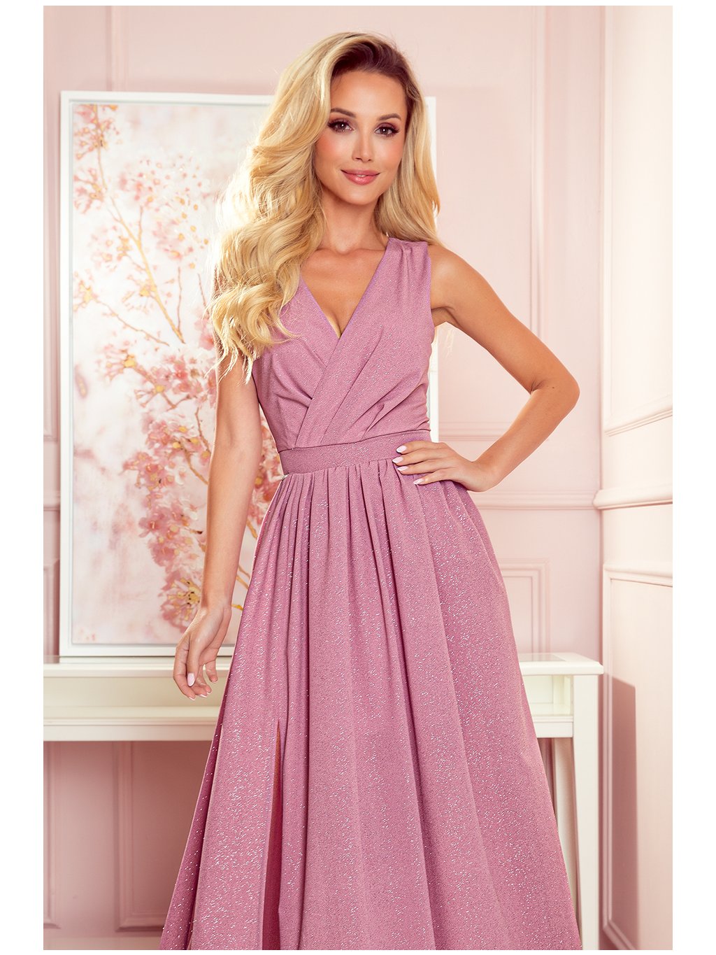Dlhé ružové spoločenské šaty s výstrihom a trblietkami GERDA