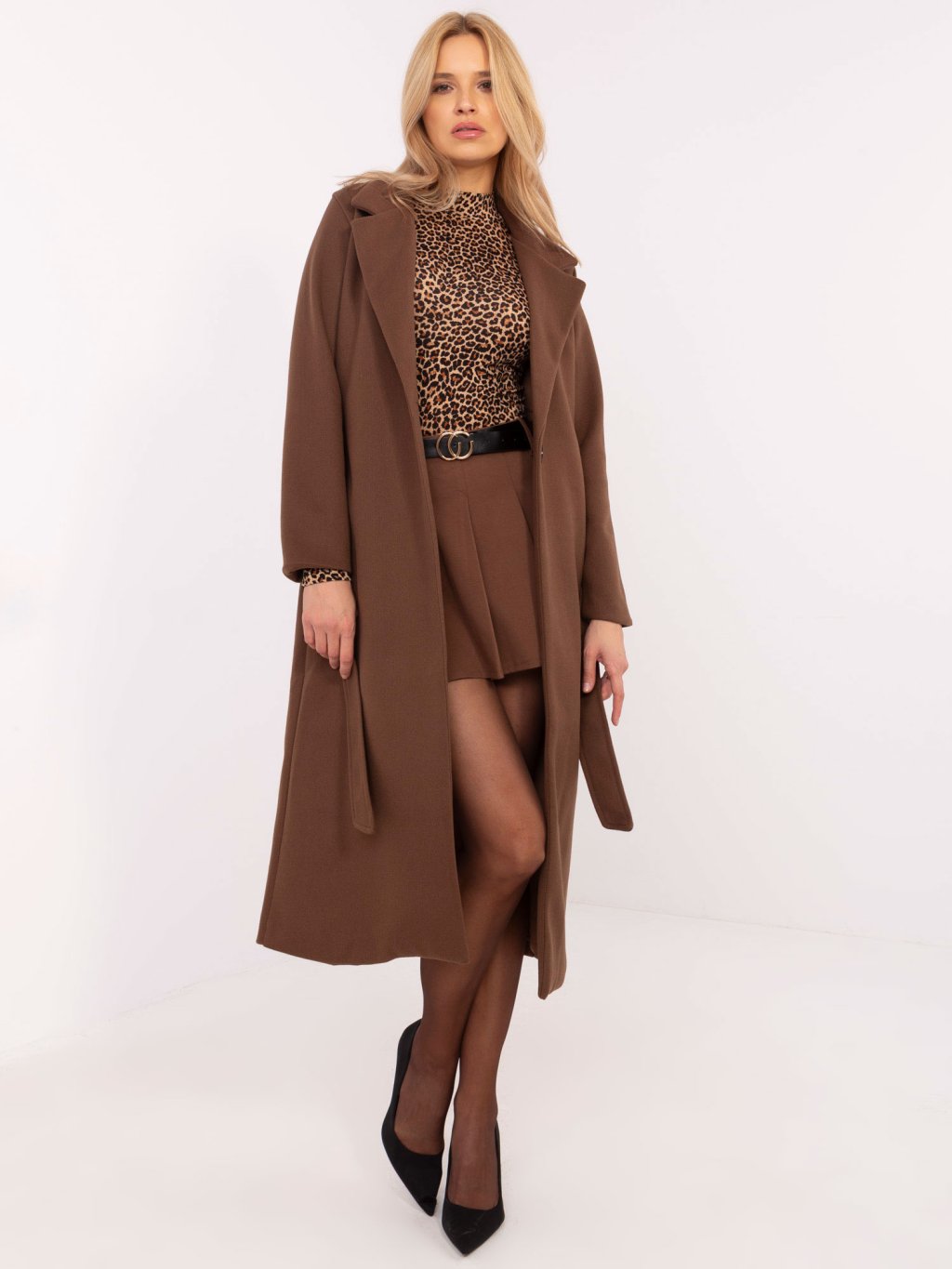Dlhý tmavohnedý kabát s pásikom
