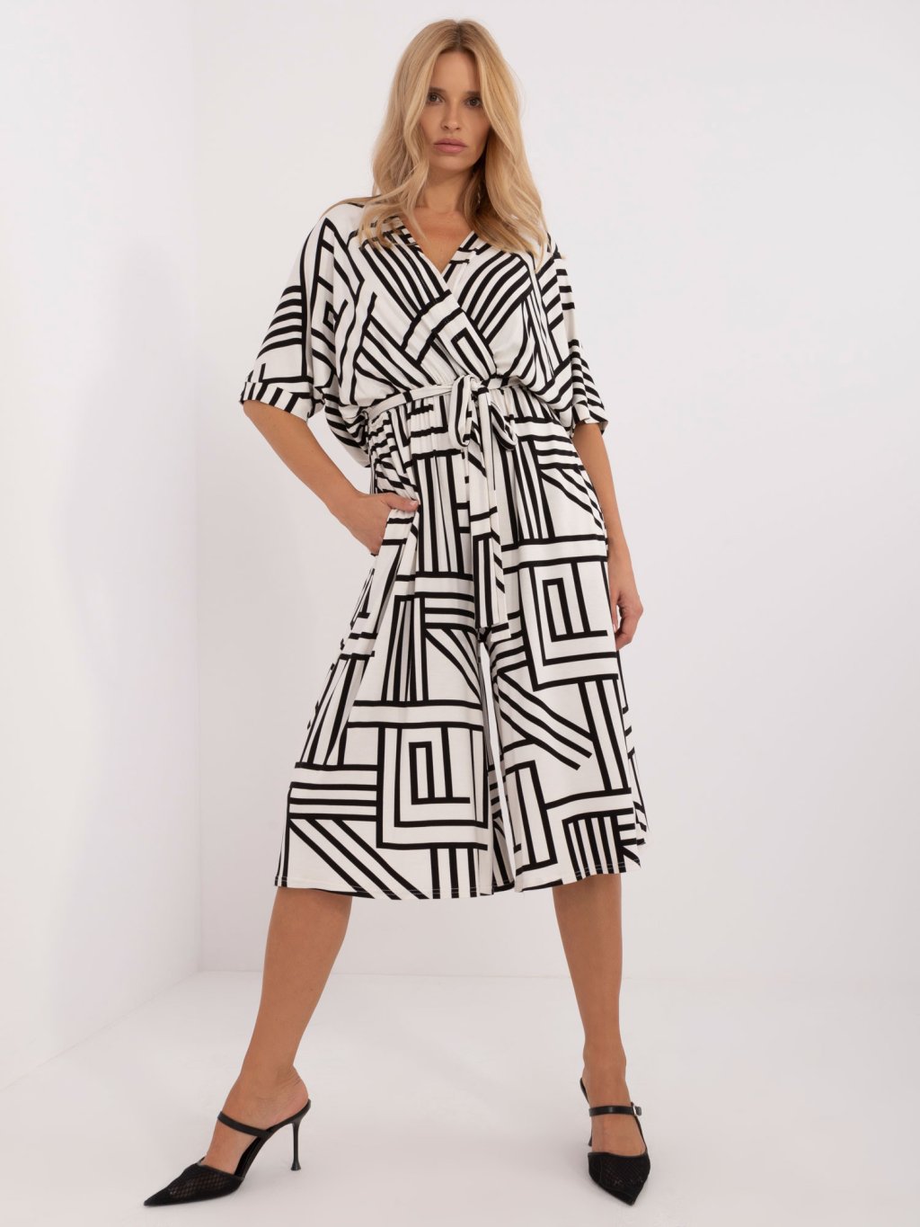 Modelka na obrázkoch je vysoká 175 cm, obvod cez prsia má 84 cm, obvod pása 65 cm a boky 92 cm.