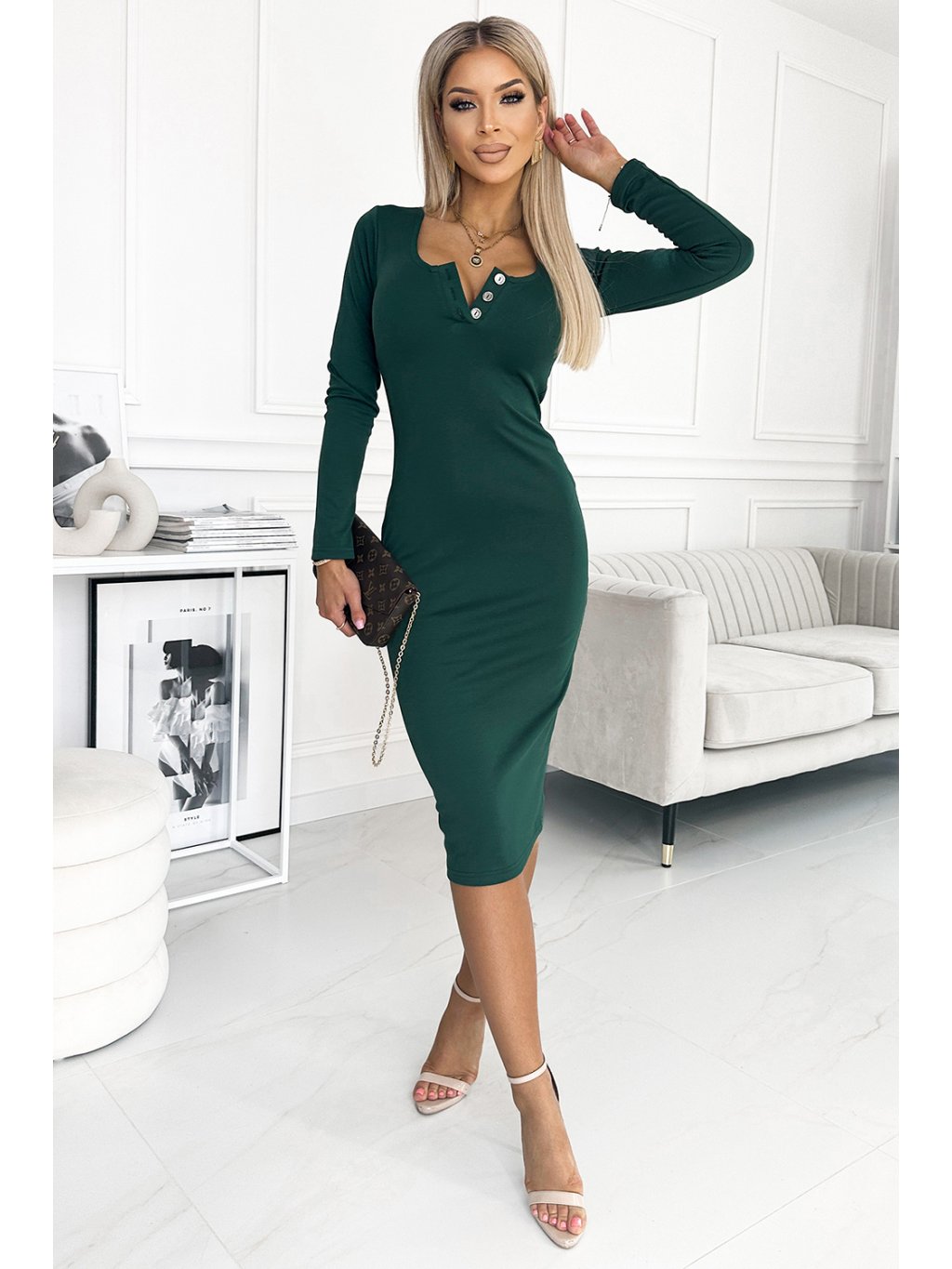 Elastické zelené šaty s gombíkmi na výstrihu BIBIANA