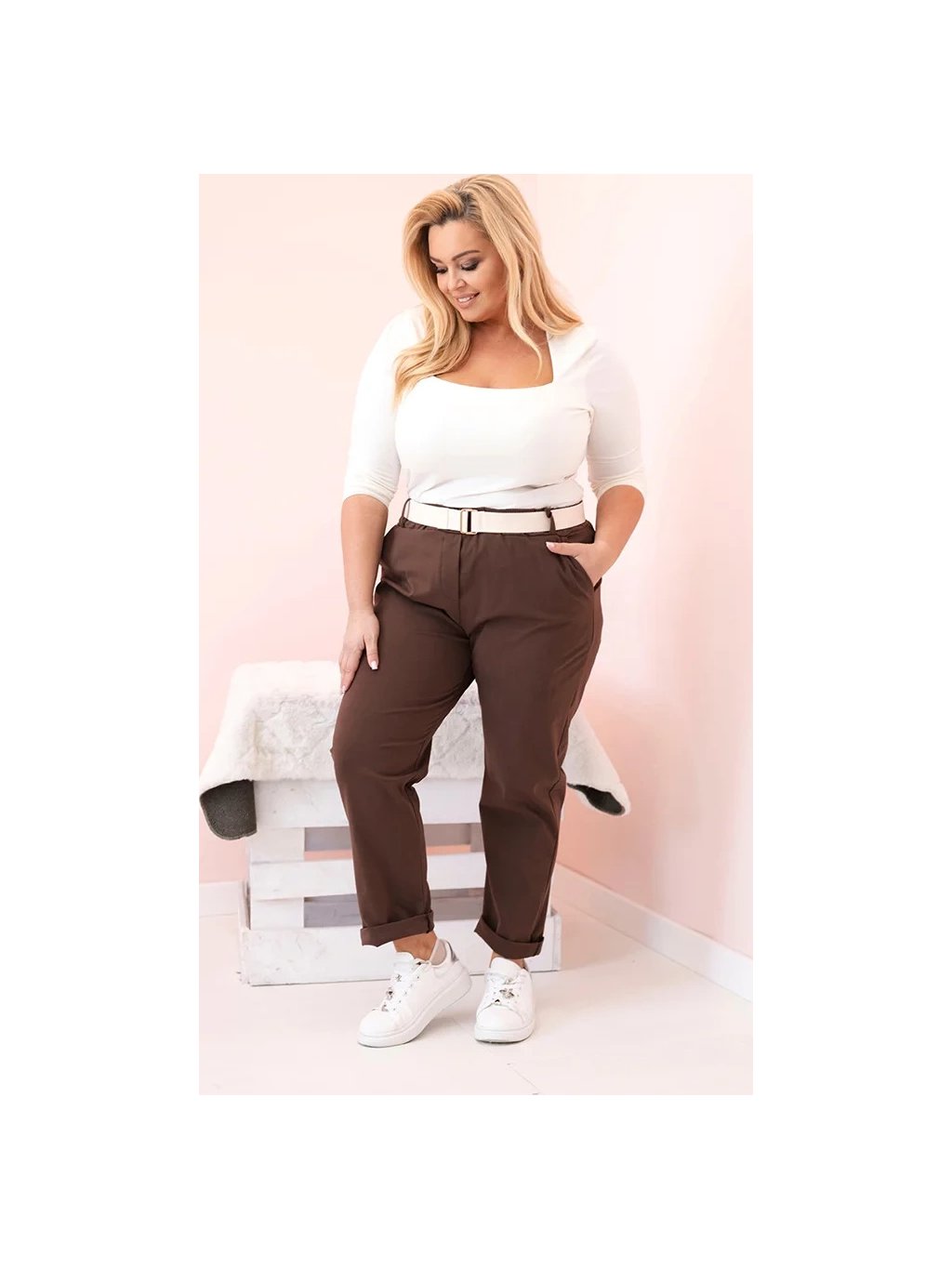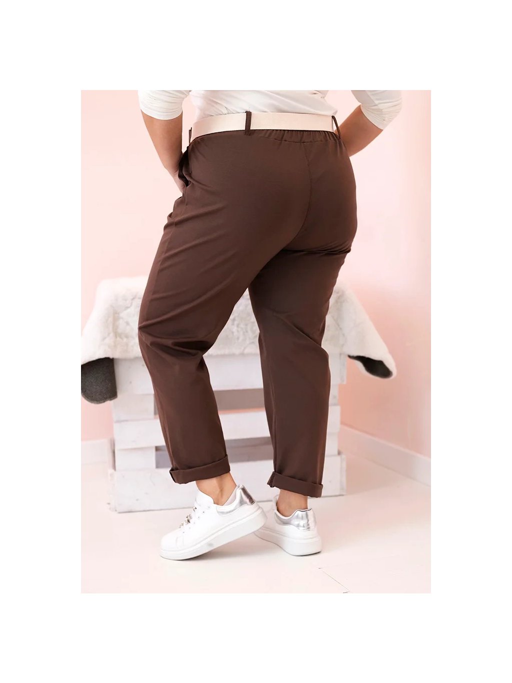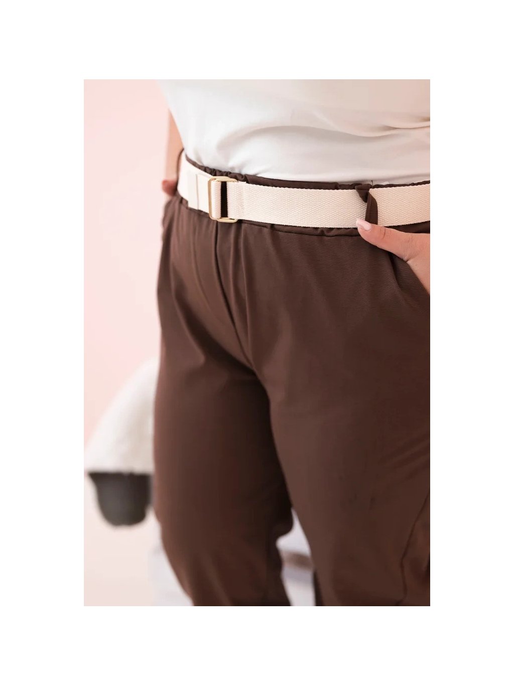 Hnedé dámske bavlnené plus size nohavice s pásikom