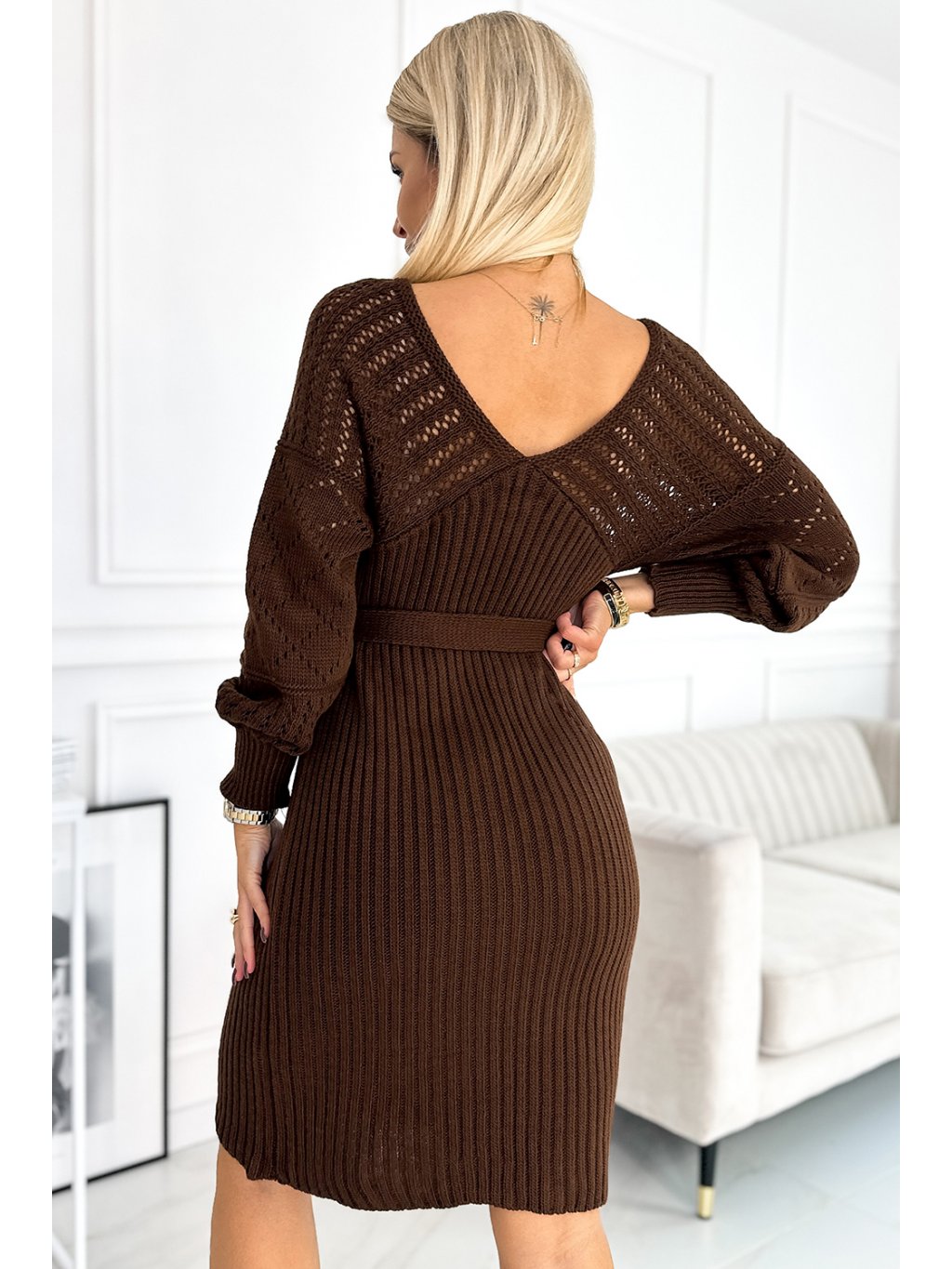 Hnedé pletené šaty s pásikom