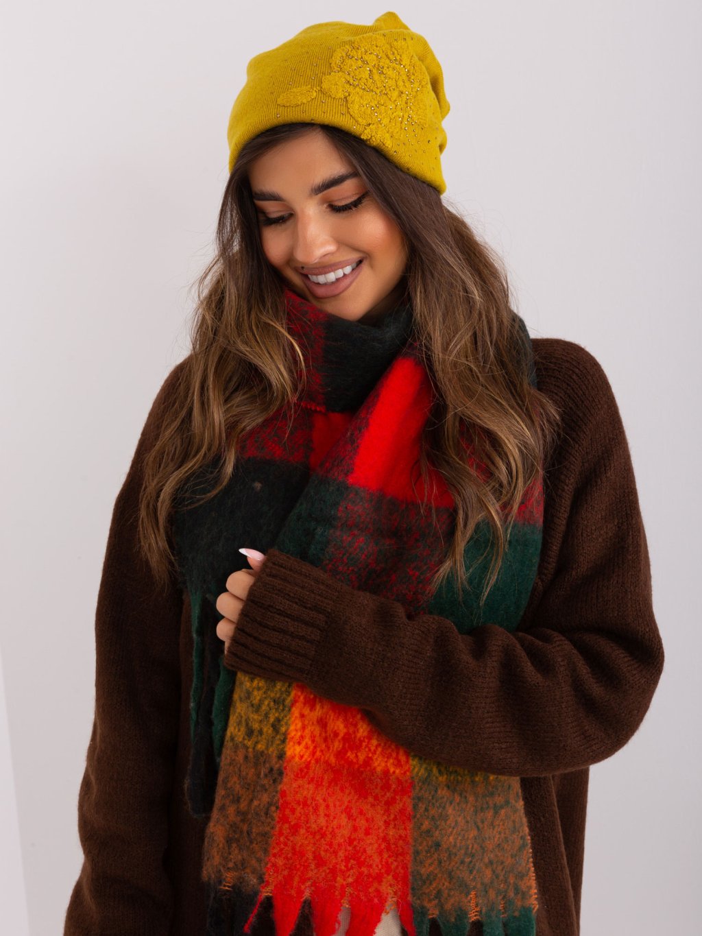 Horčicová zimná čiapka s kamienkami
