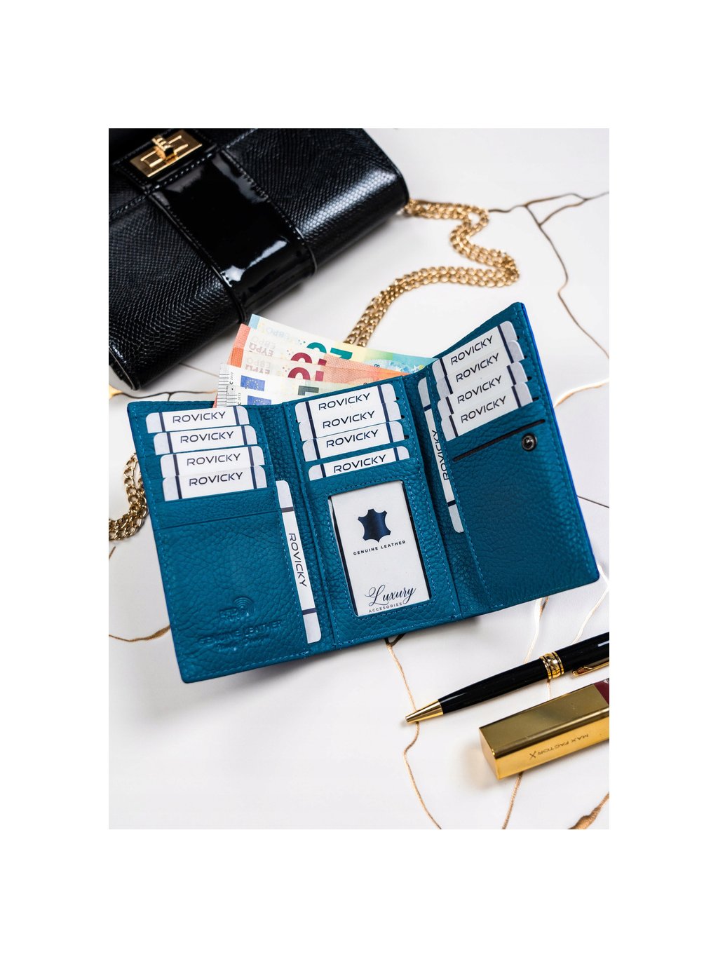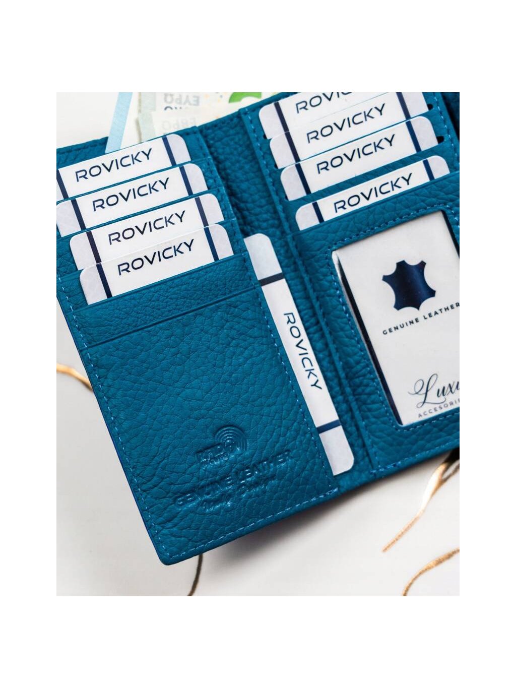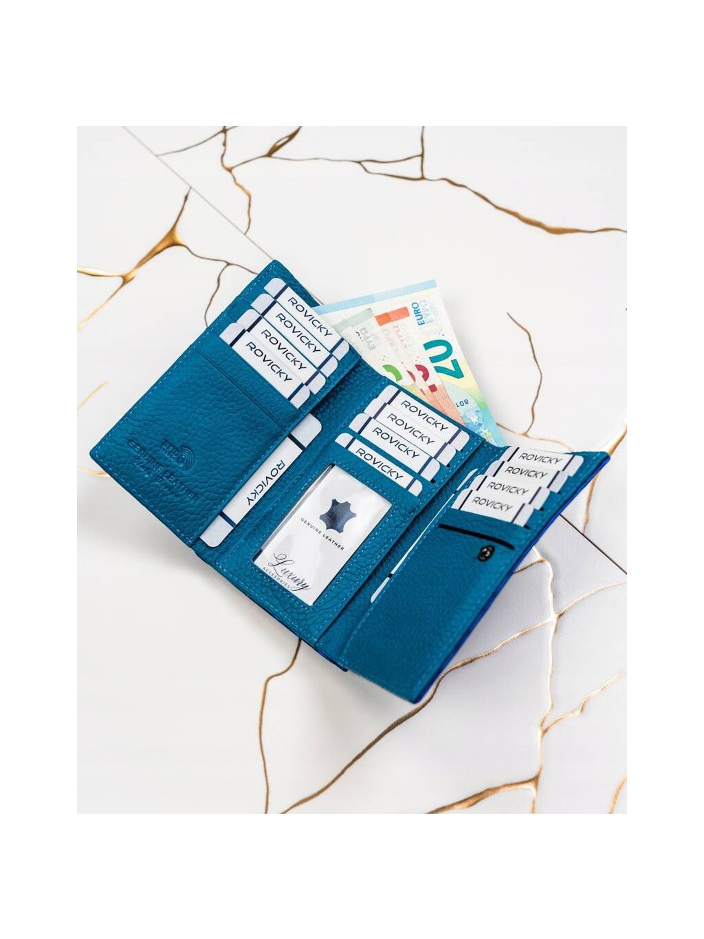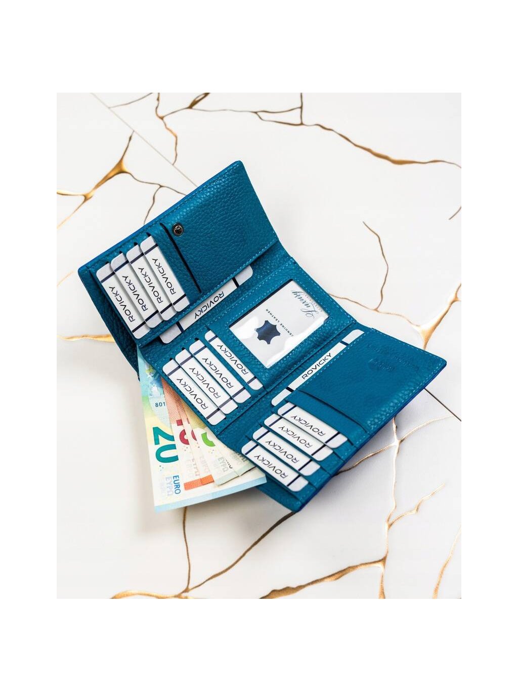 - 2 široké priehradky na bankovky po celej dĺžke peňaženky
