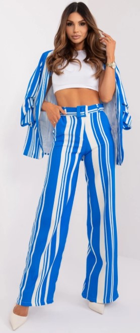 - Modrobiele pruhované nohavice s vysokým pásom, ladiace sako, biely crop top, biele lodičky