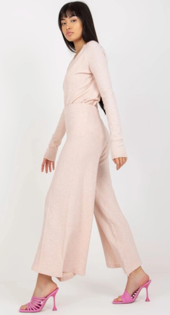 - Olivovo zelené široké nohavice, fialovoružový top s dlhým rukávom a otvoreným chrbtom, nude sandálky na podpätku