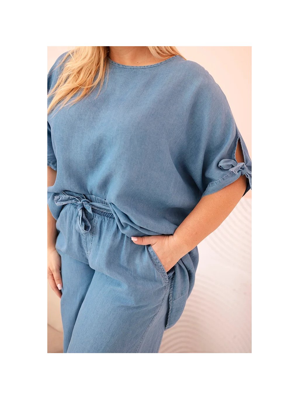 Modrá dámska plus size súprava blúzky a širokých nohavíc