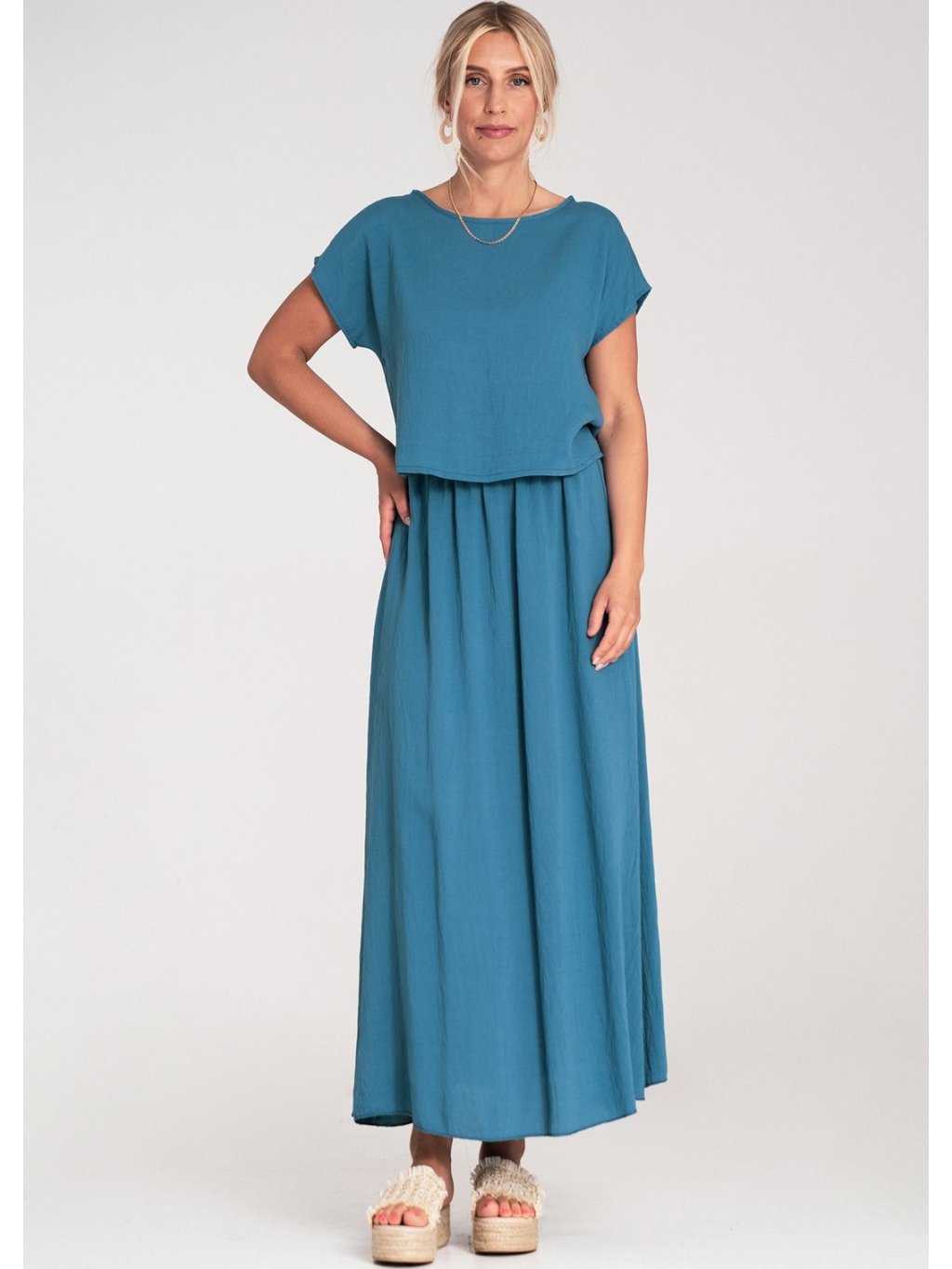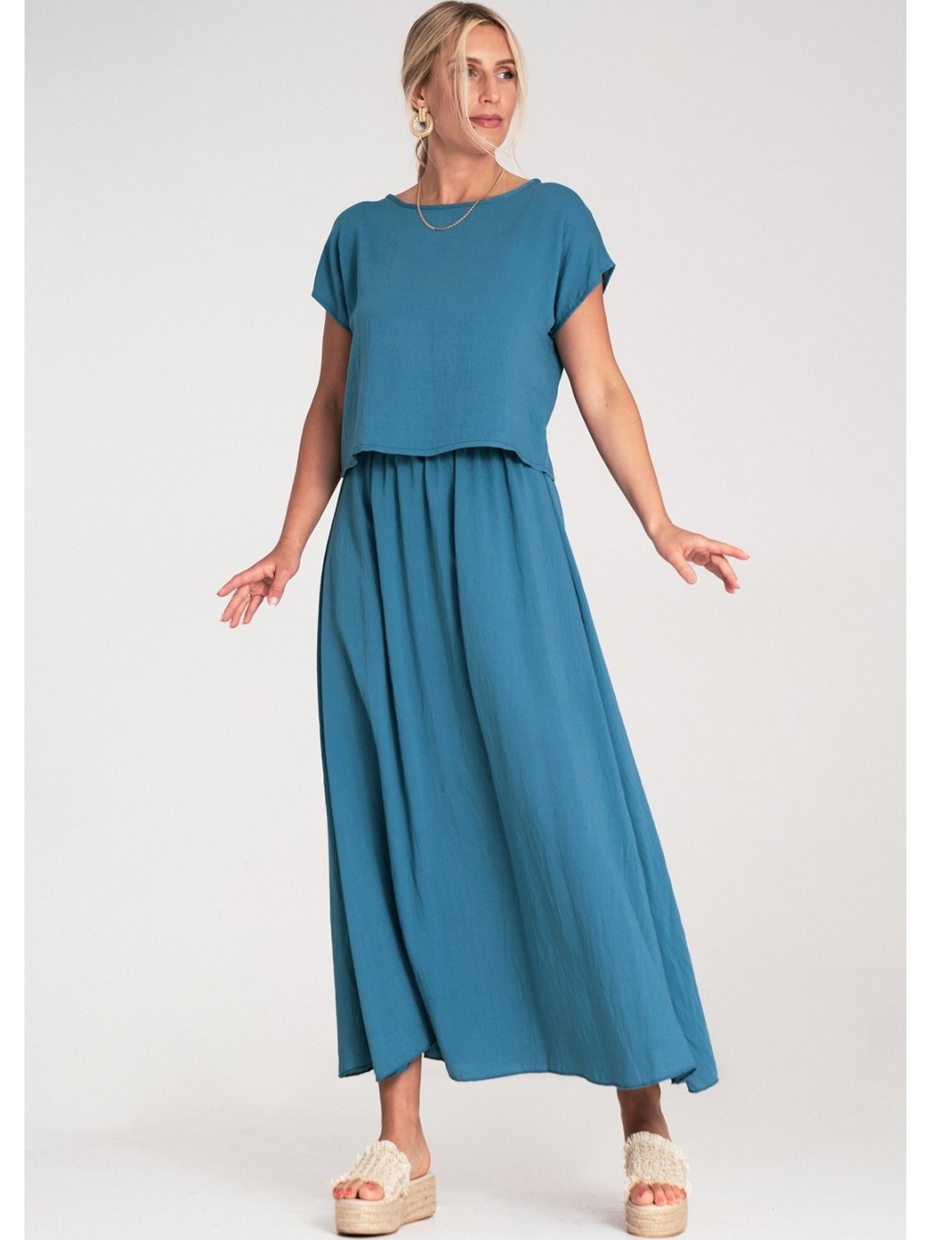 Modrá dámska viskózová súprava voľnej blúzky a sukne s elastickým pásom