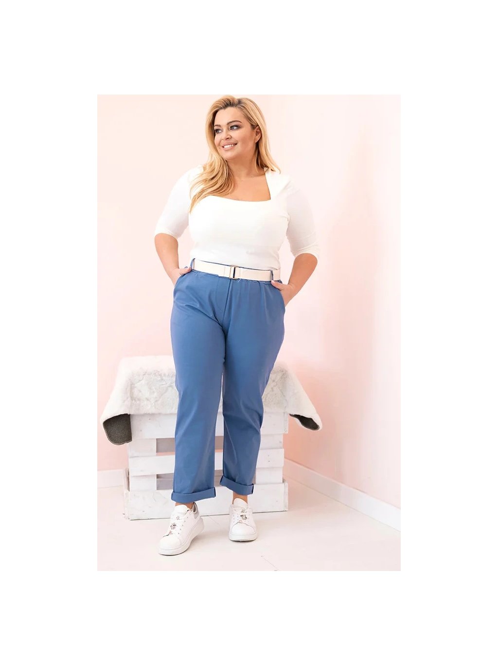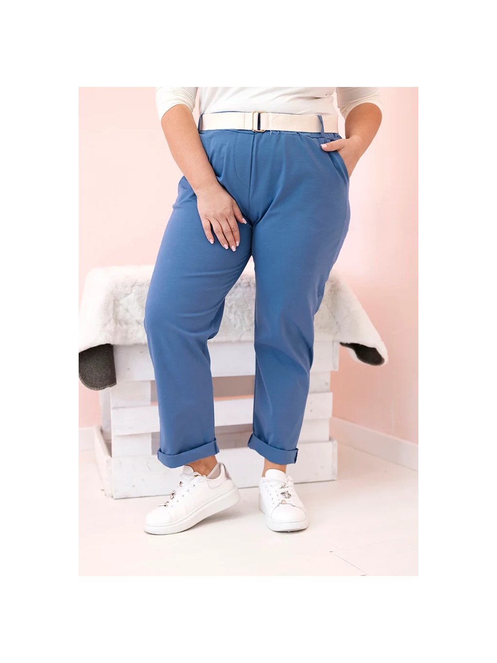 Modré dámske bavlnené plus size nohavice s pásikom