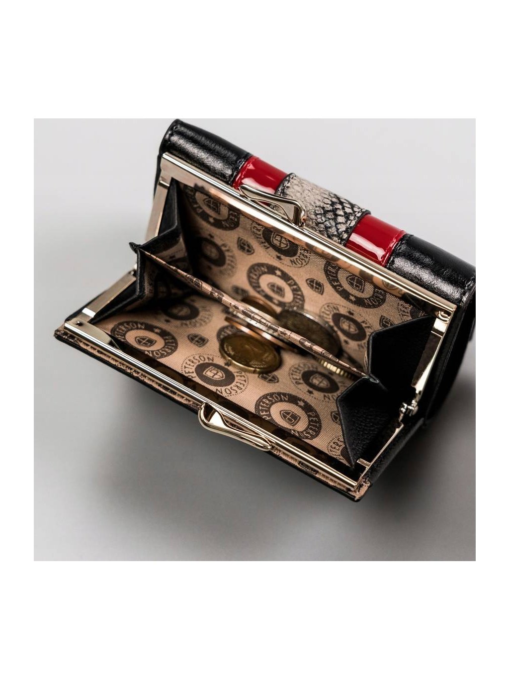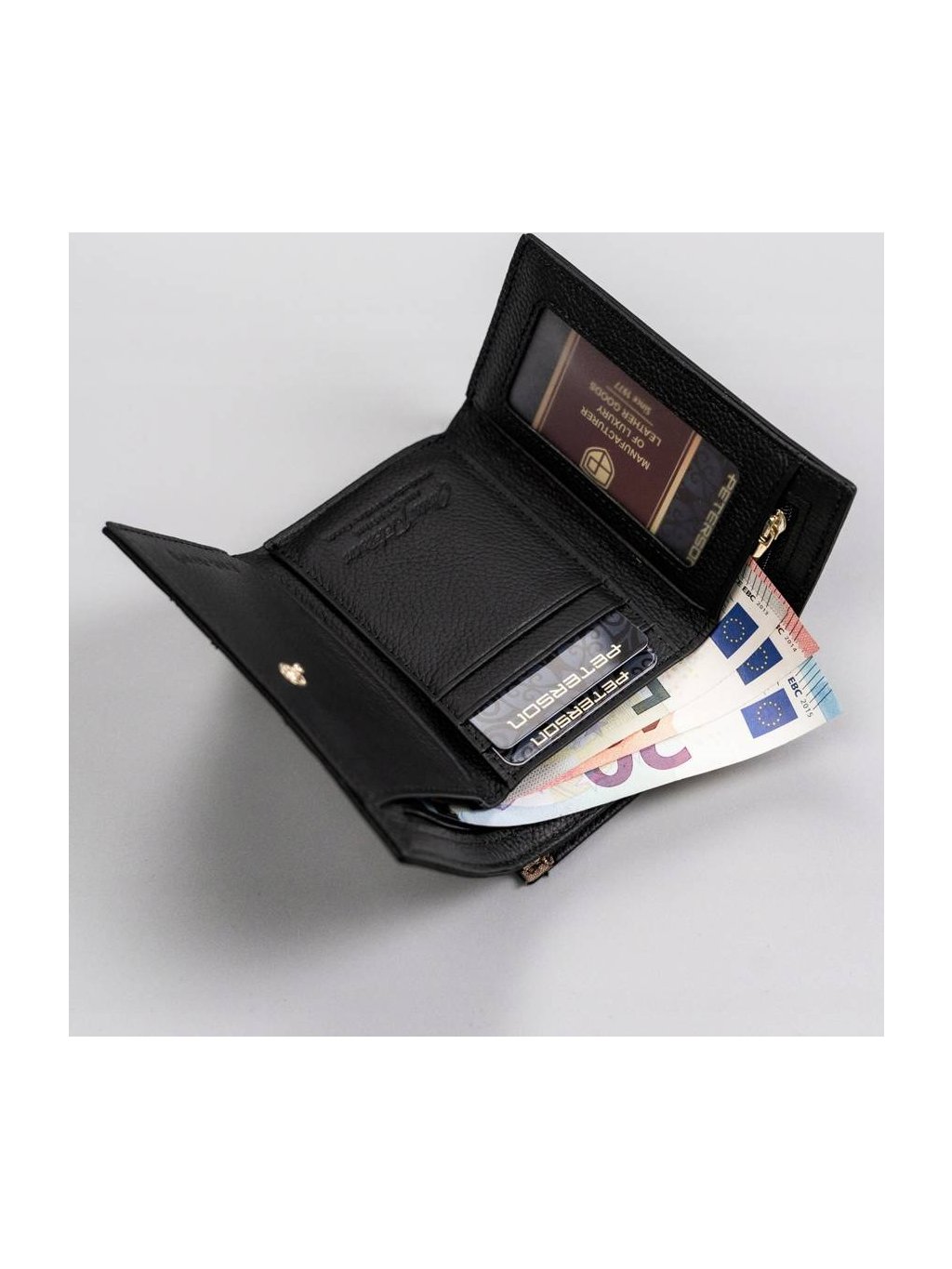 • vo vnútri má priehradku na bankovky, dvojité vrecko na mince, 5 miest pre karty