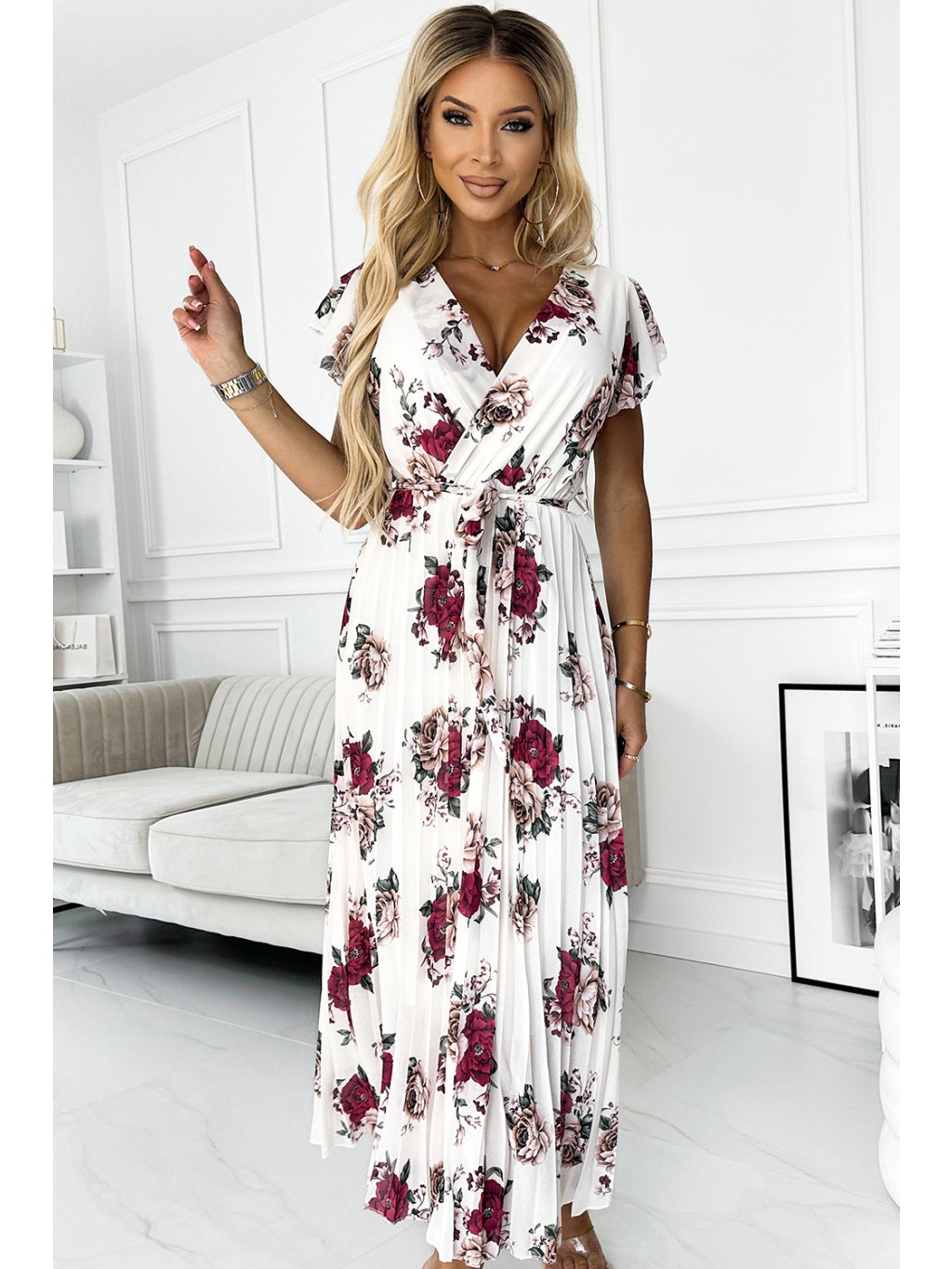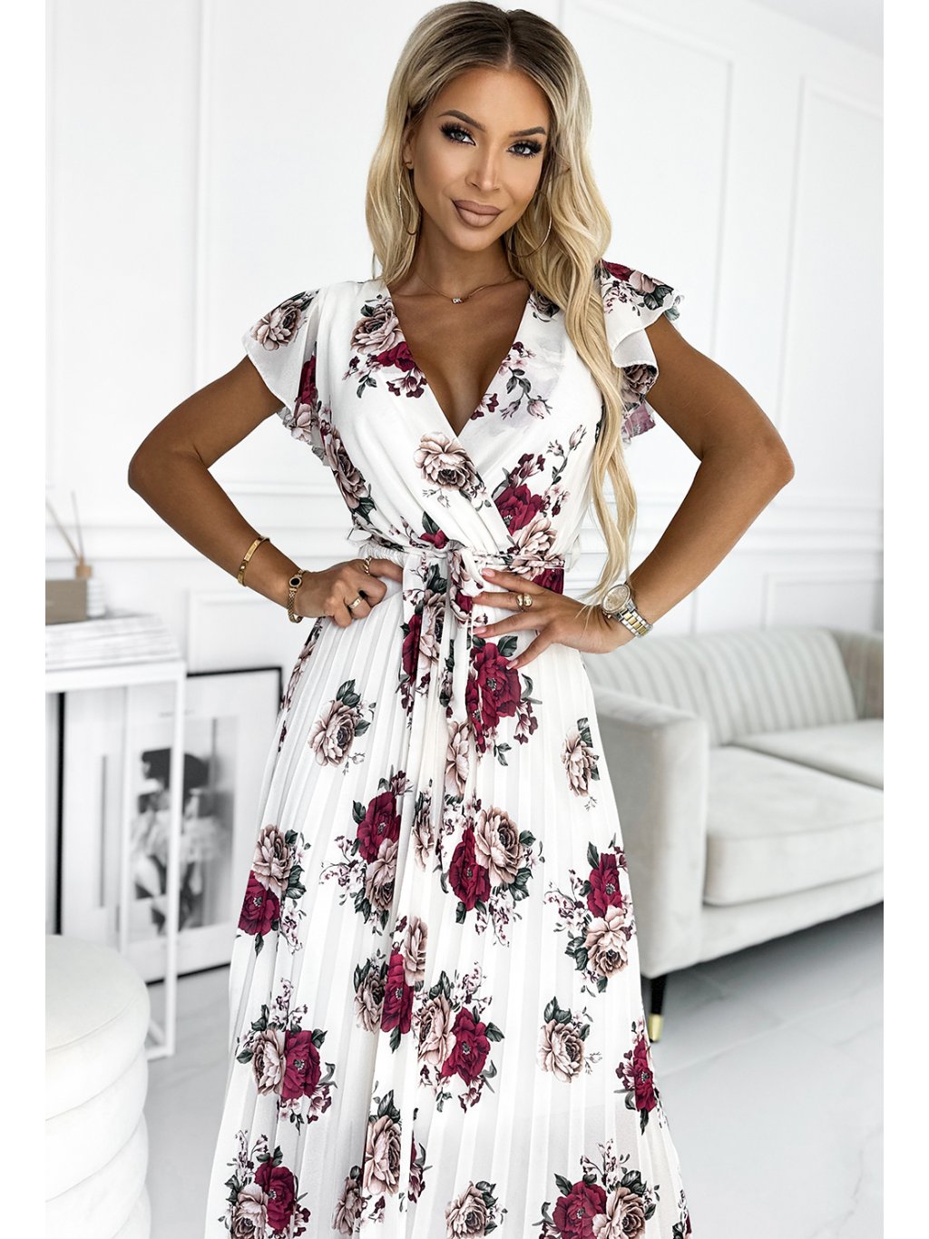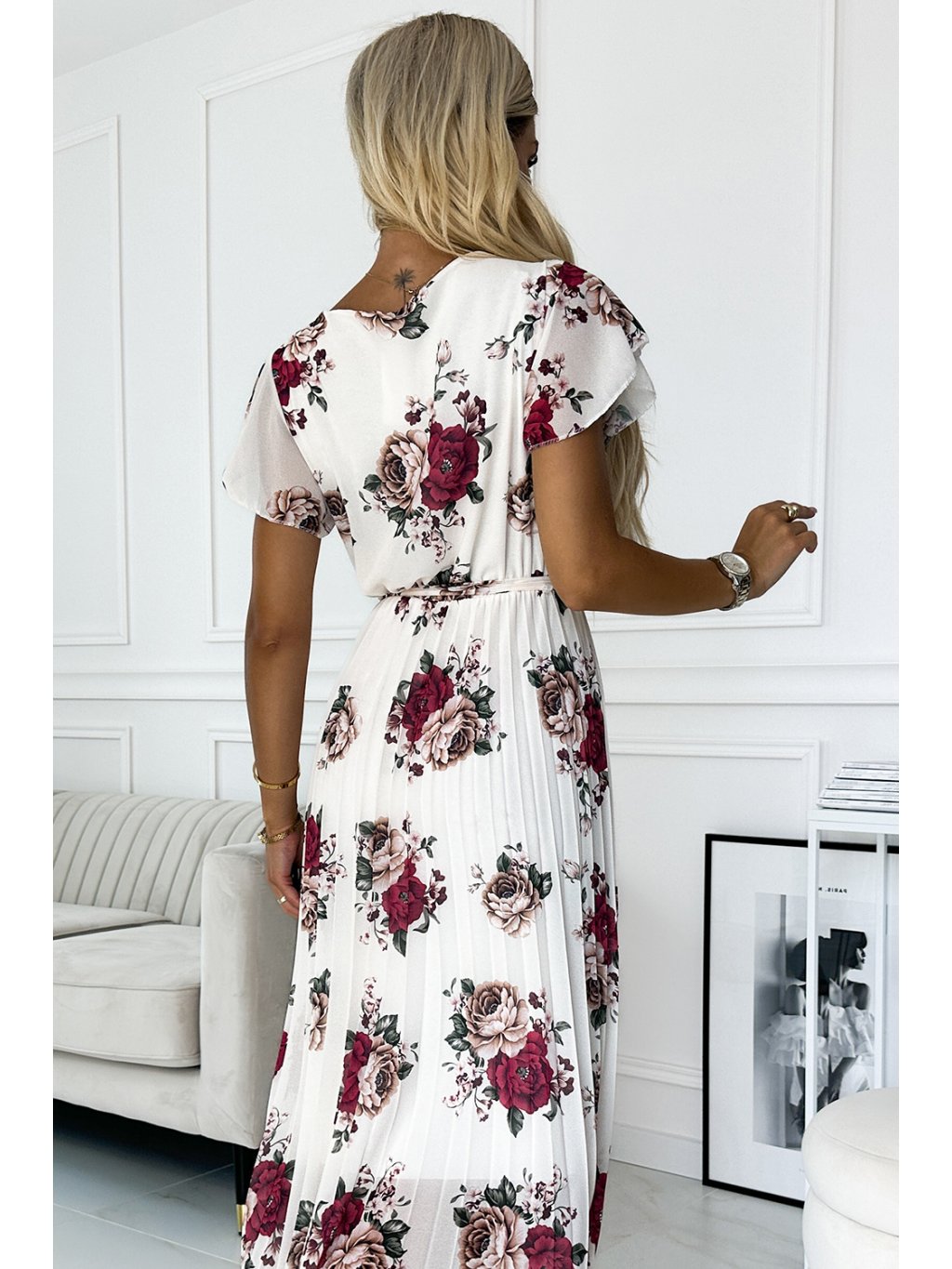 Plisované kvetované midi šaty s výstrihom a volánikmi MEDIE