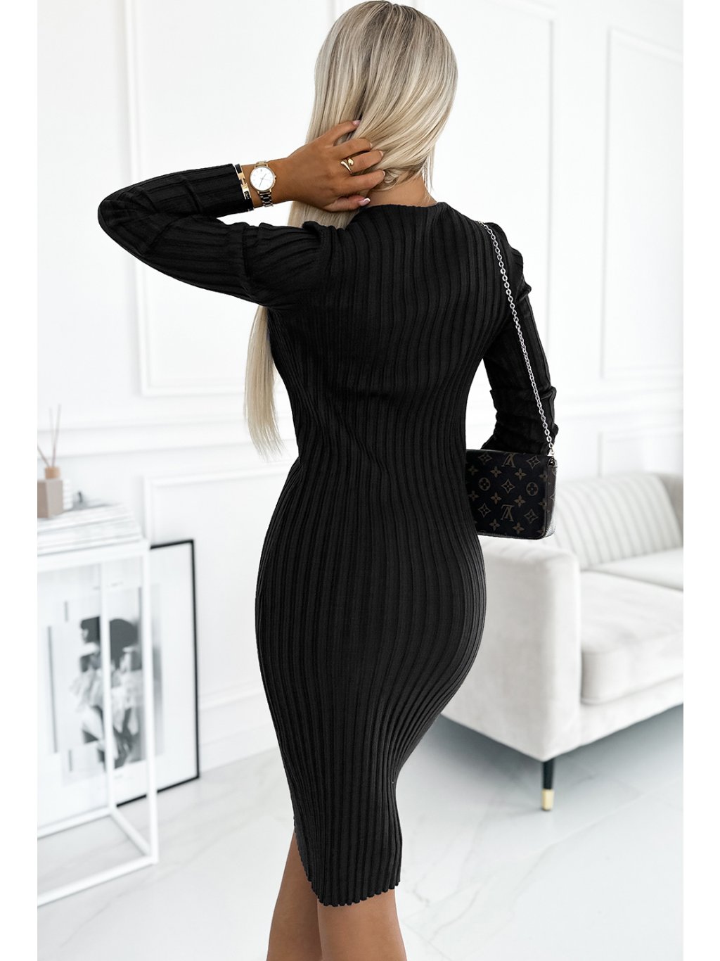 Pohodlné čierne svetrové šaty s výstrihom do V