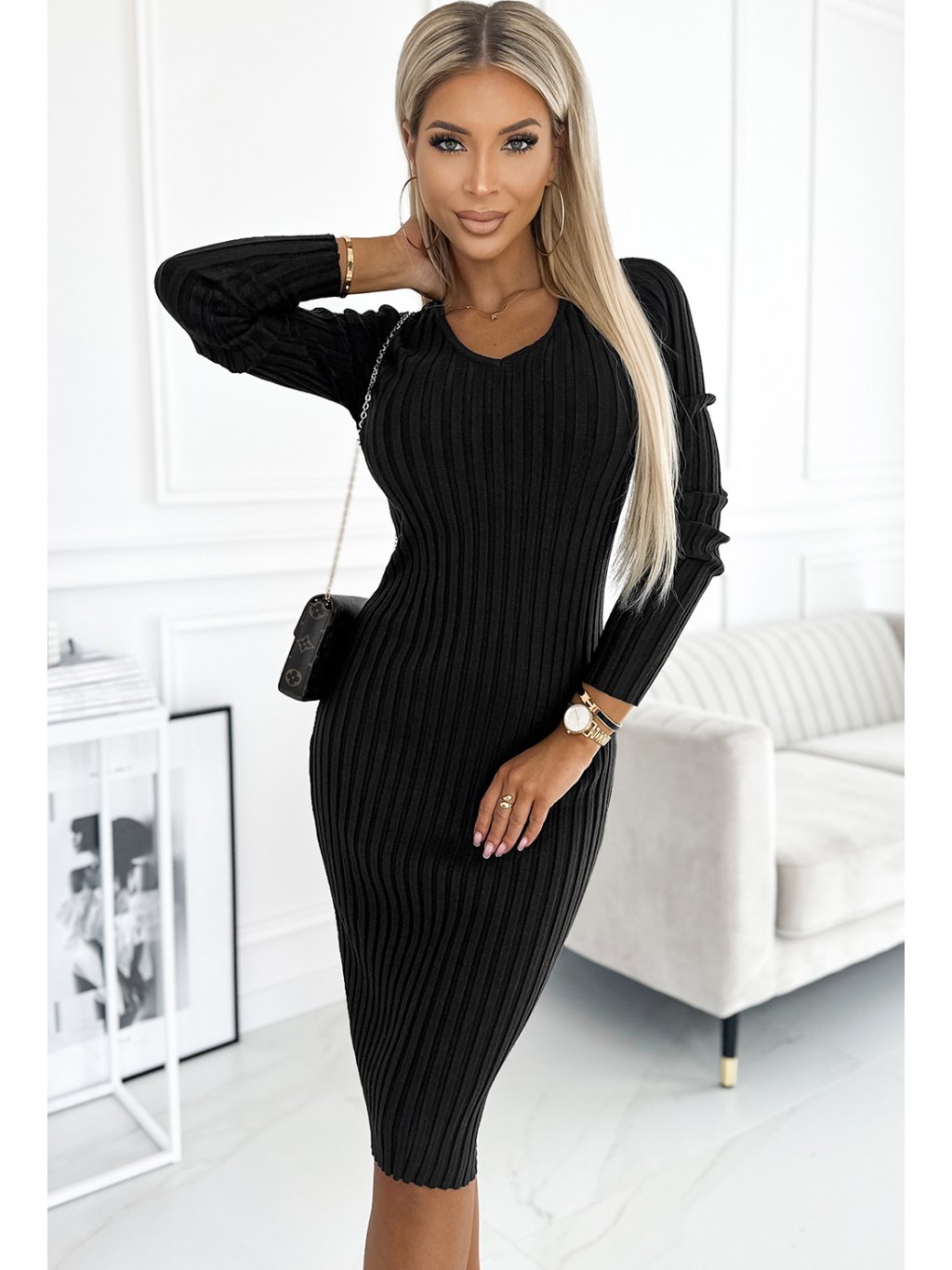 Pohodlné čierne svetrové šaty s výstrihom do V (Veľkosť ONE SIZE)