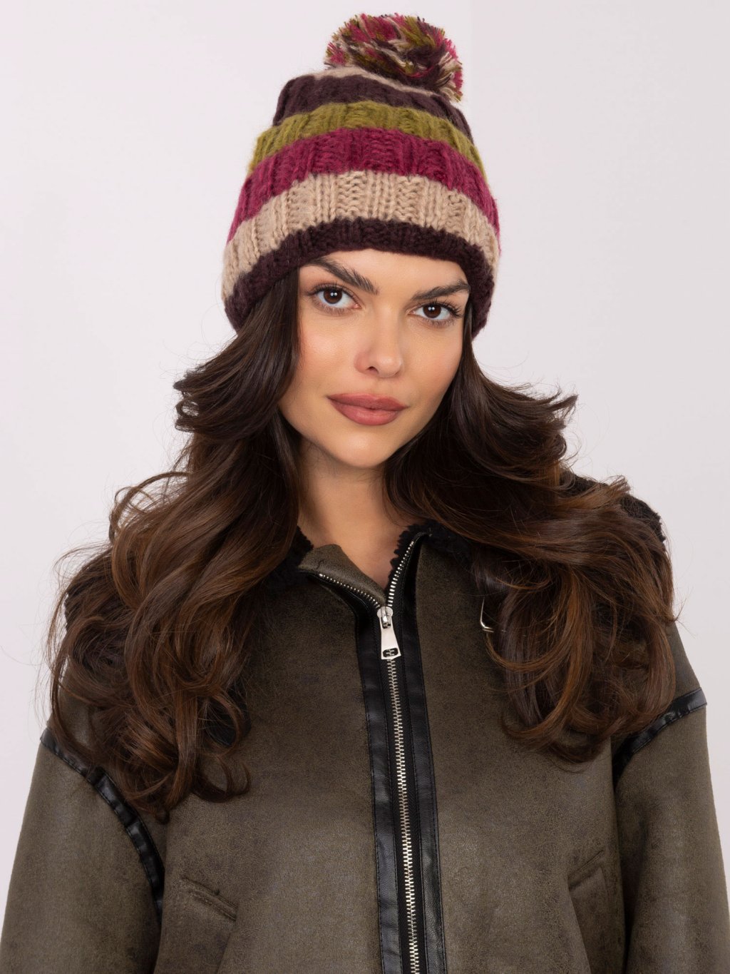 Pruhovaná dámska zimná čiapka s brmbolcom - béžová