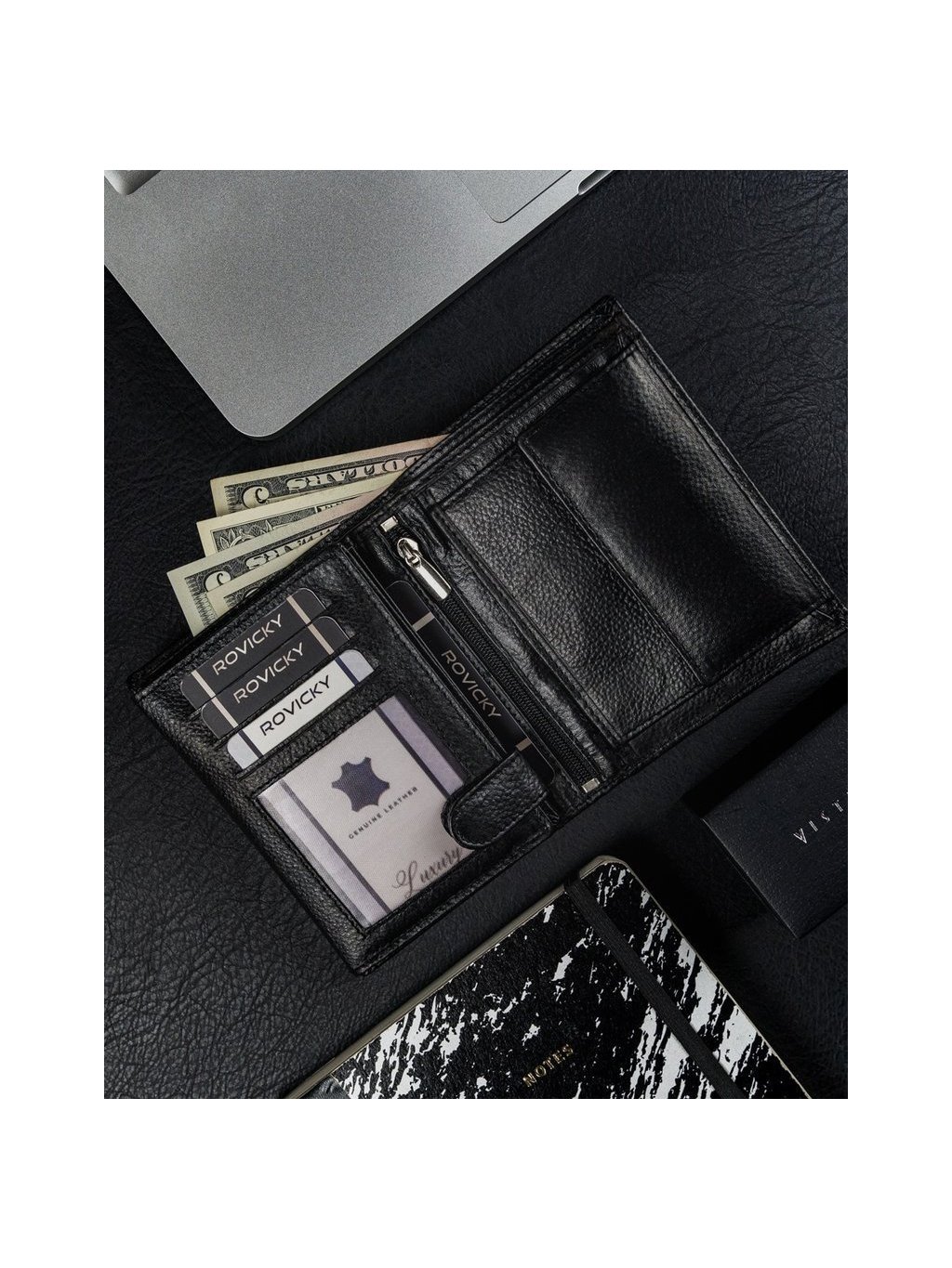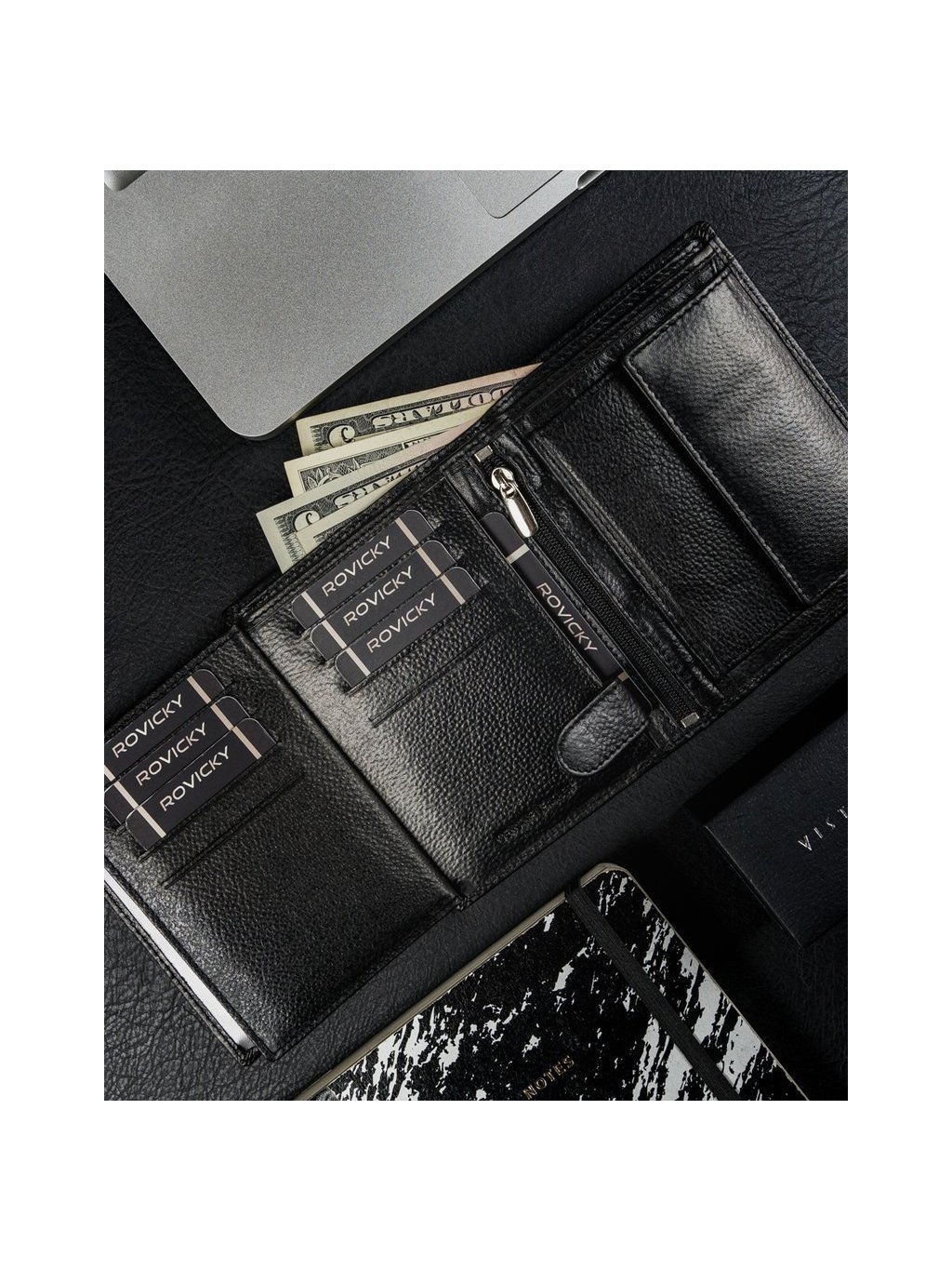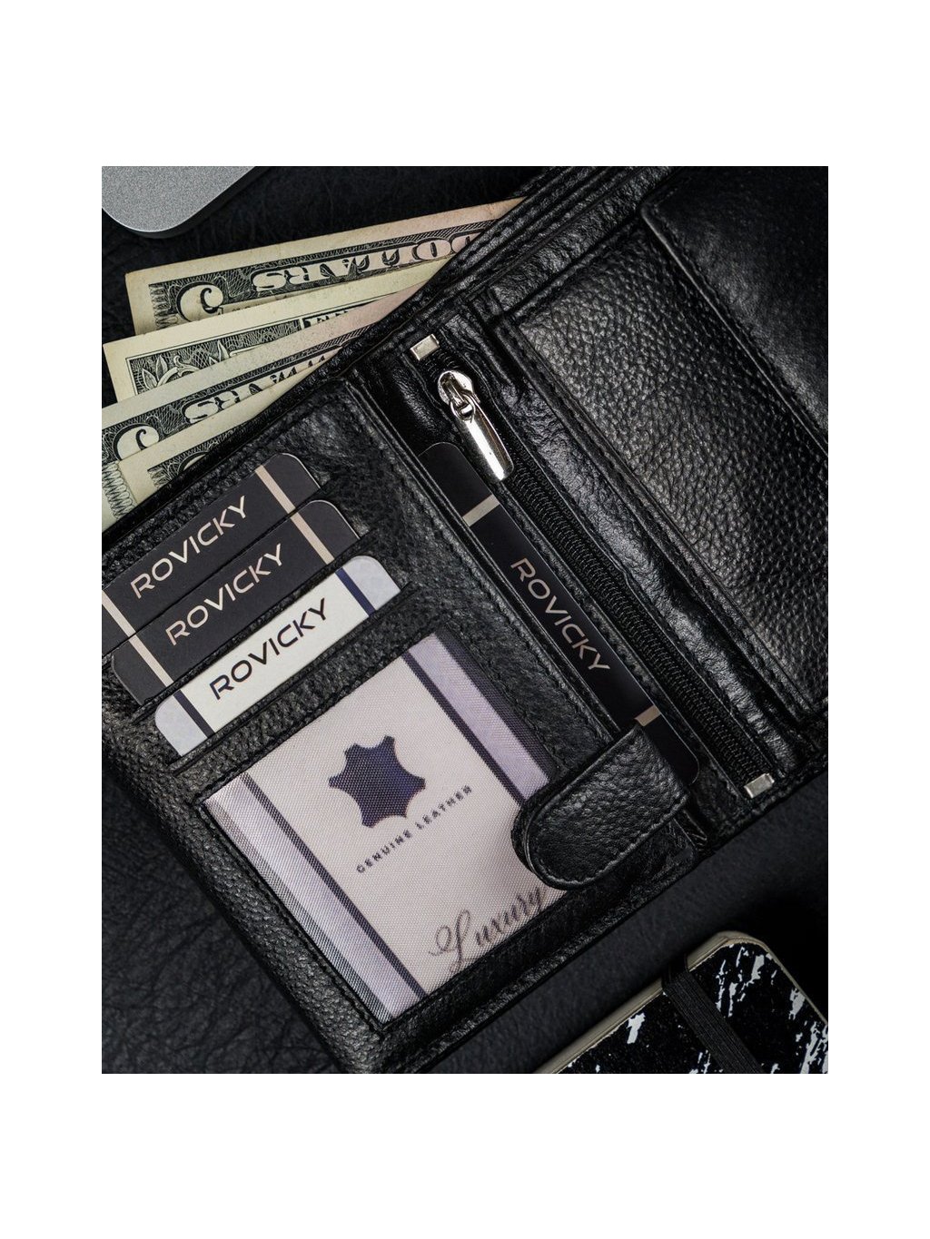 - vo vnútri má 10 miest na karty, 4 miesta na väčšie doklady, vrecko na zips, vrecko na mince na patent, 2 priehradky na bankovky