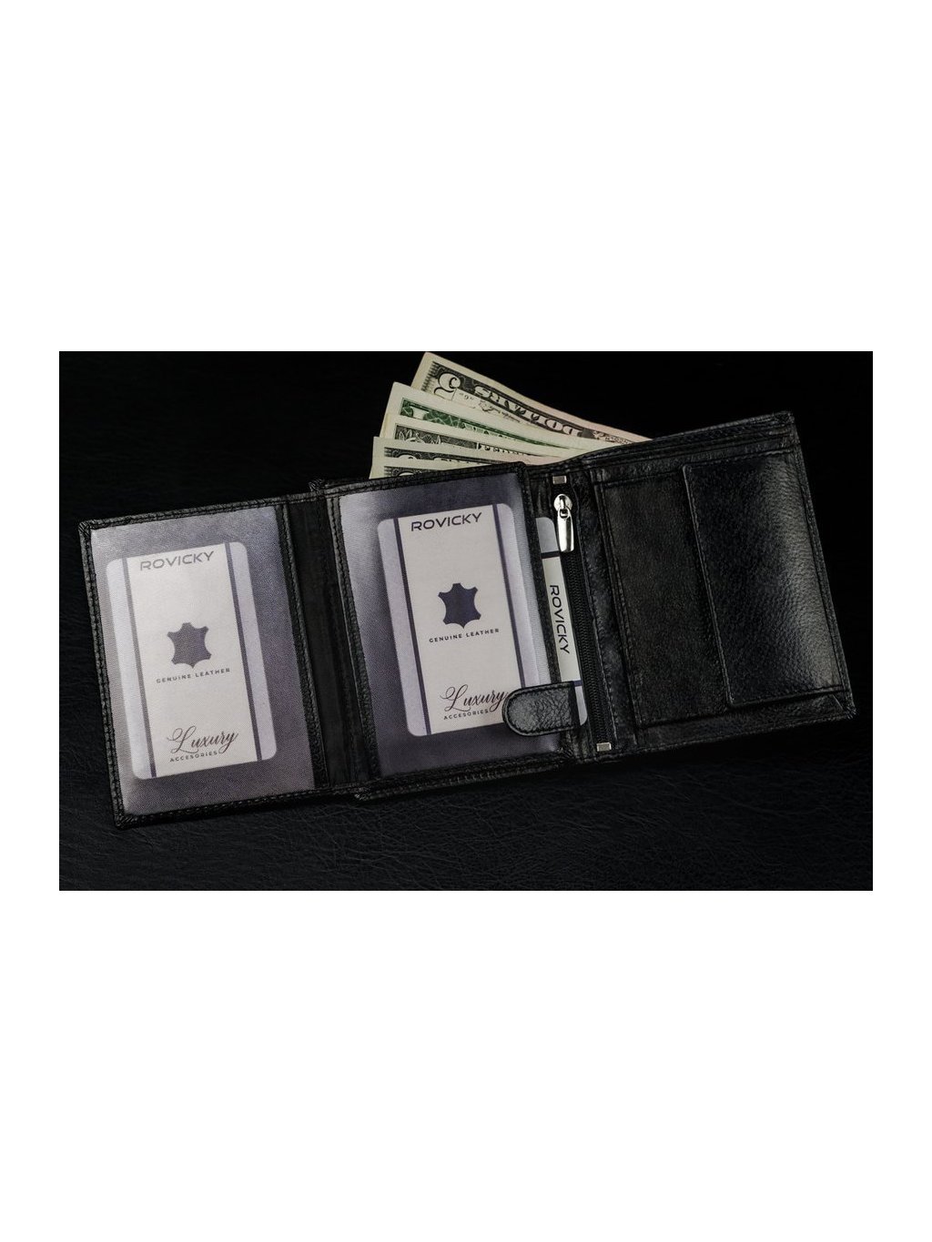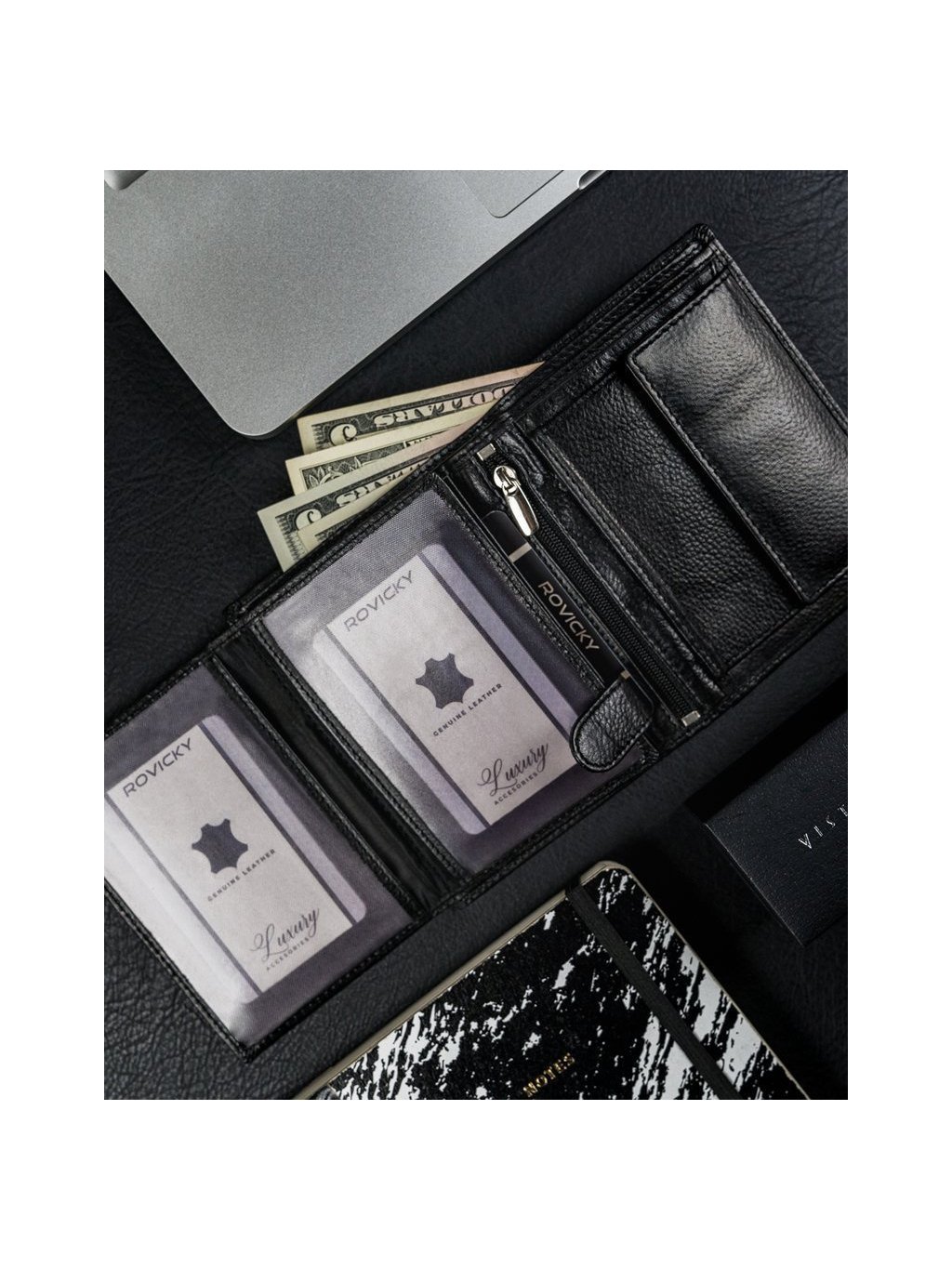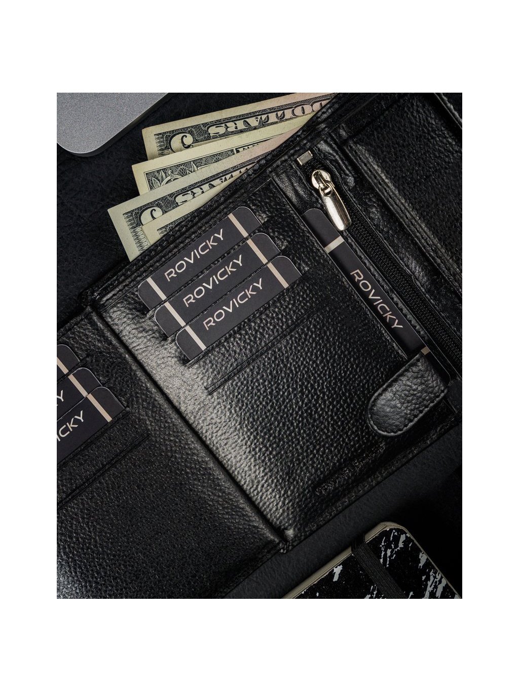 - vo vnútri má 10 miest na karty, 4 miesta na väčšie doklady, vrecko na zips, vrecko na mince na patent, 2 priehradky na bankovky