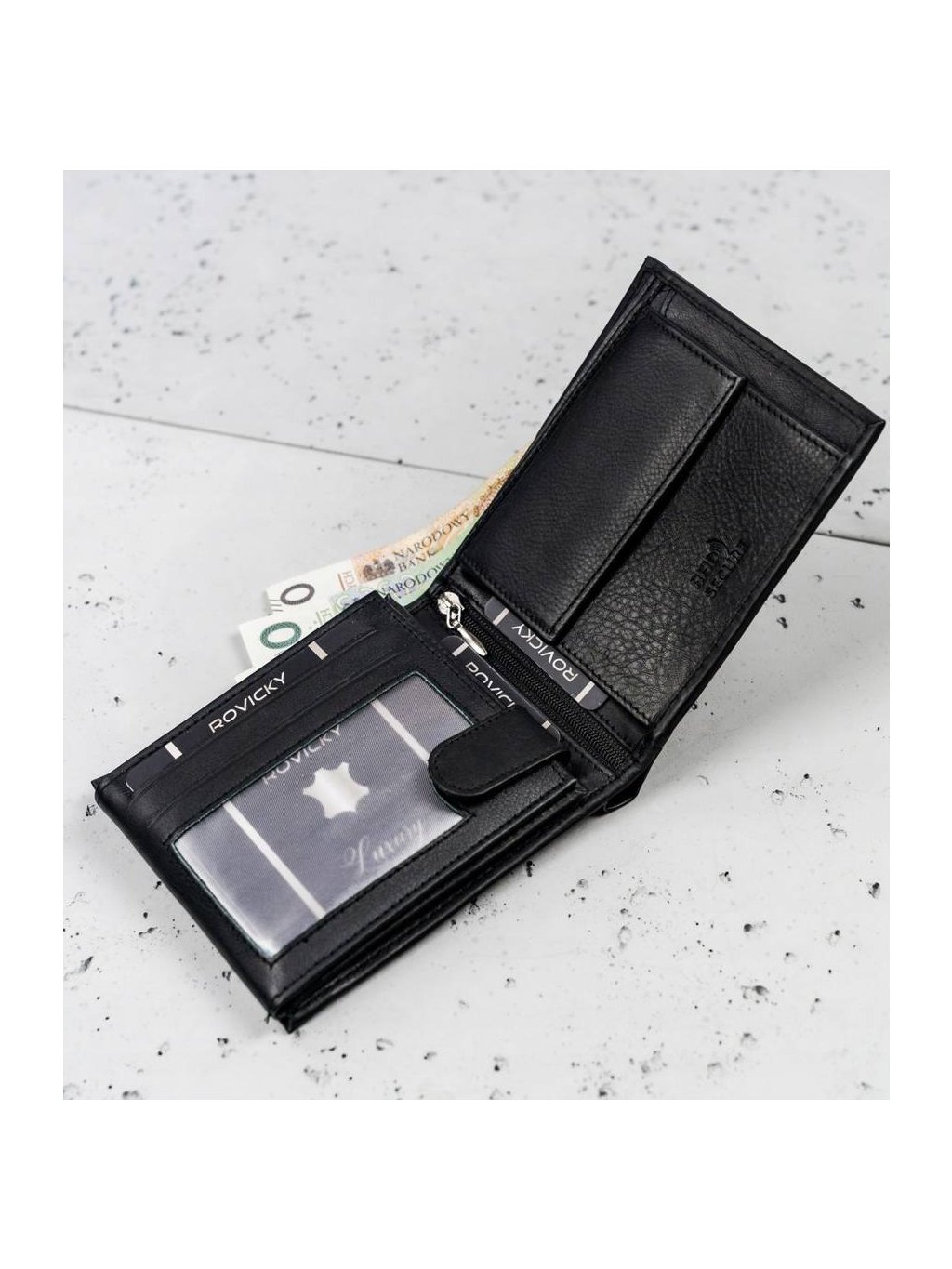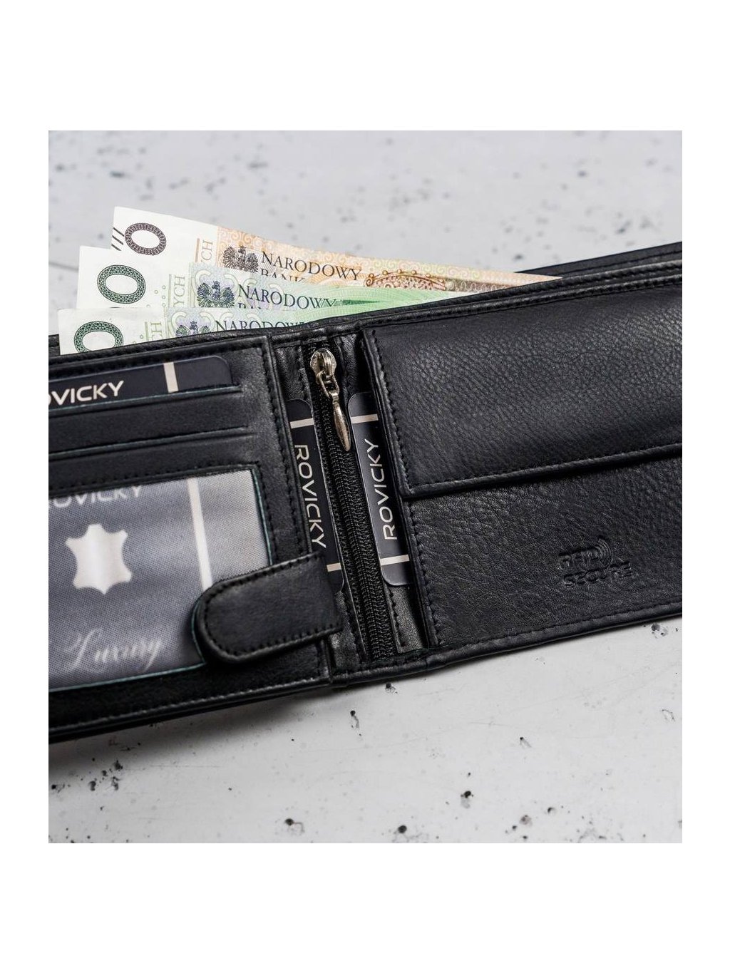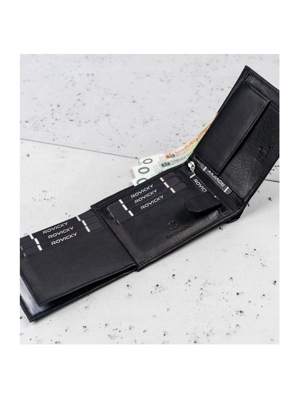 • vo vnútri má 8 miest na karty, 4 miesta na väčšie doklady, vrecko na zips, vrecko na mince na patent, 2 priehradky na bankovky