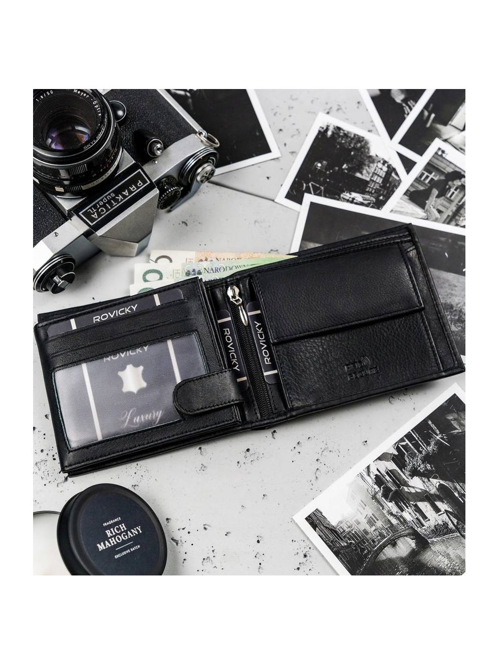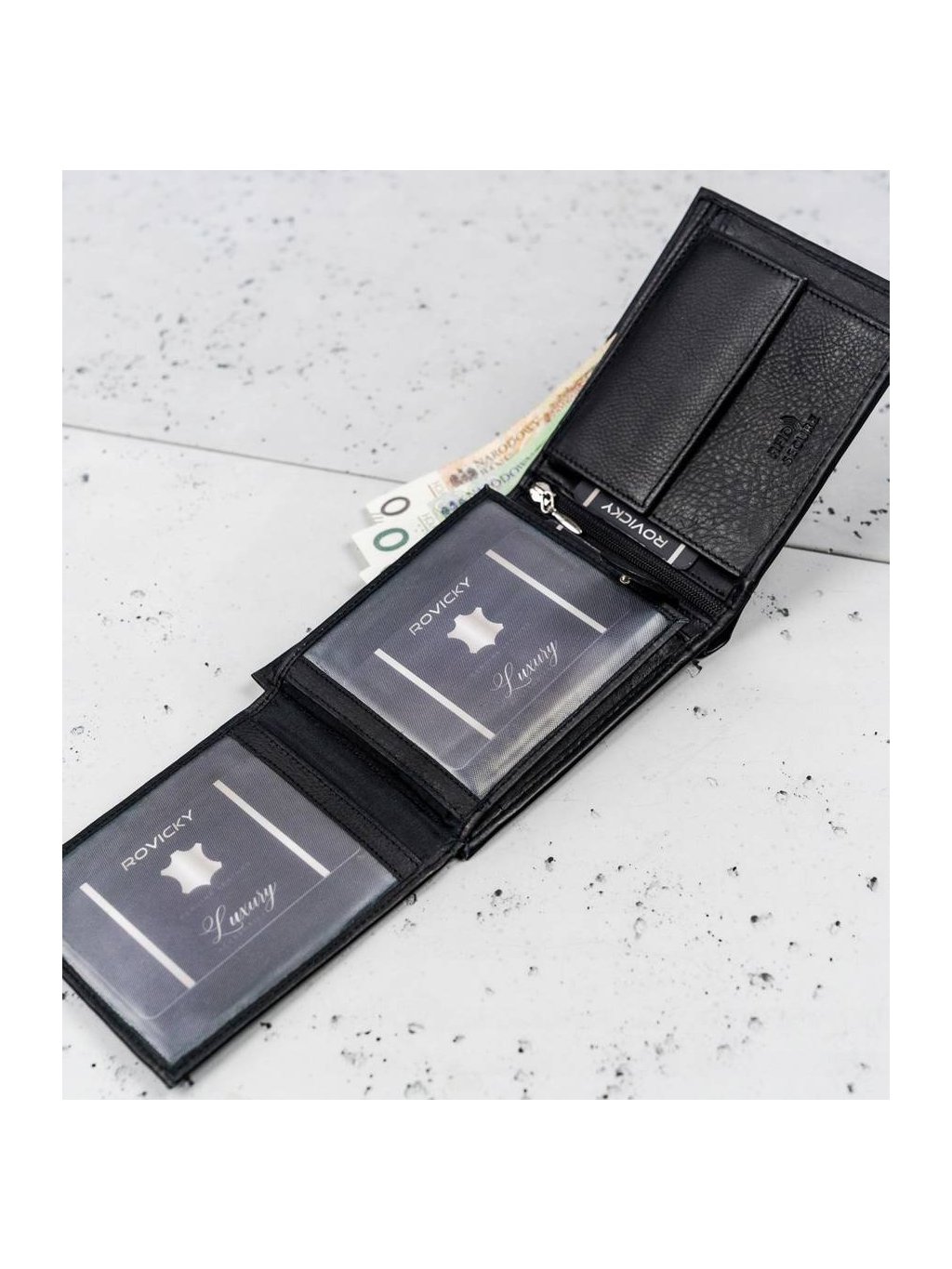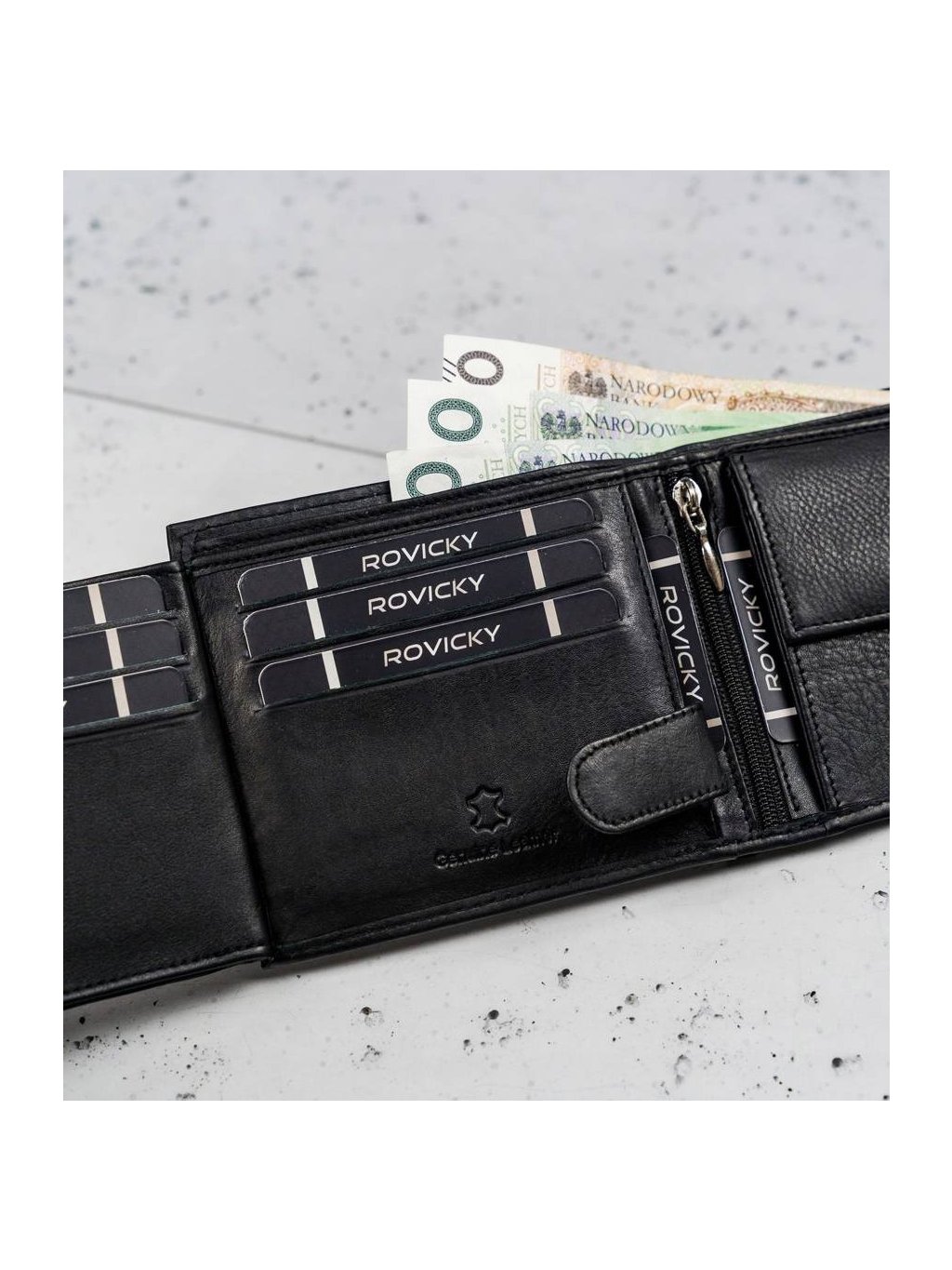 • vo vnútri má 8 miest na karty, 4 miesta na väčšie doklady, vrecko na zips, vrecko na mince na patent, 2 priehradky na bankovky