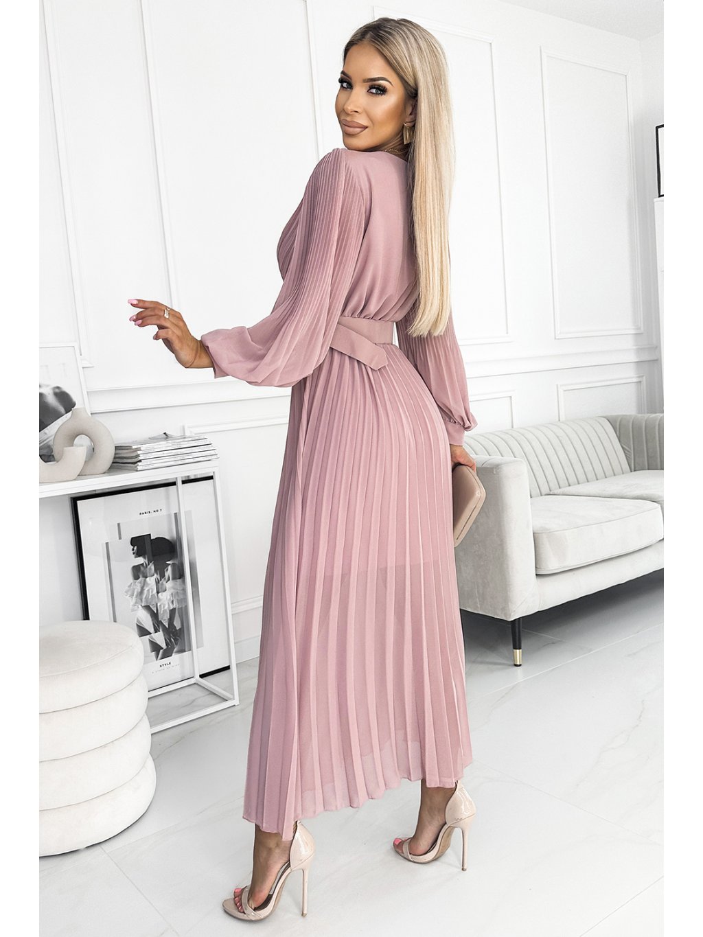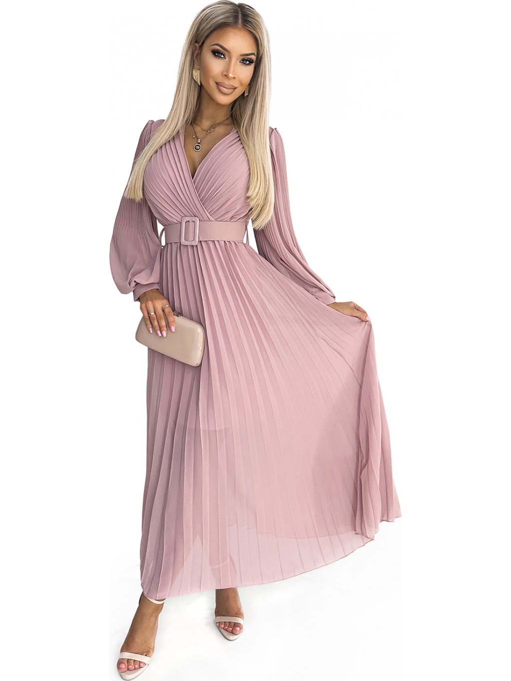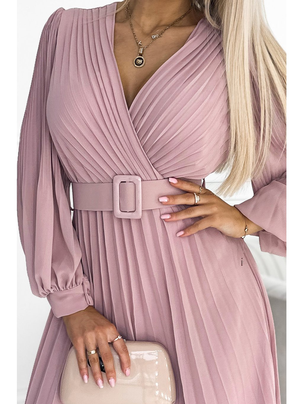 Skladané púdrové šifónové šaty s dlhými rukávmi a opaskom KLARA