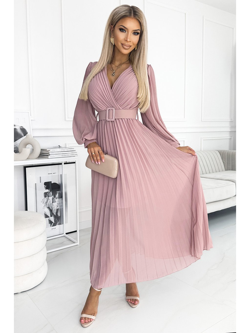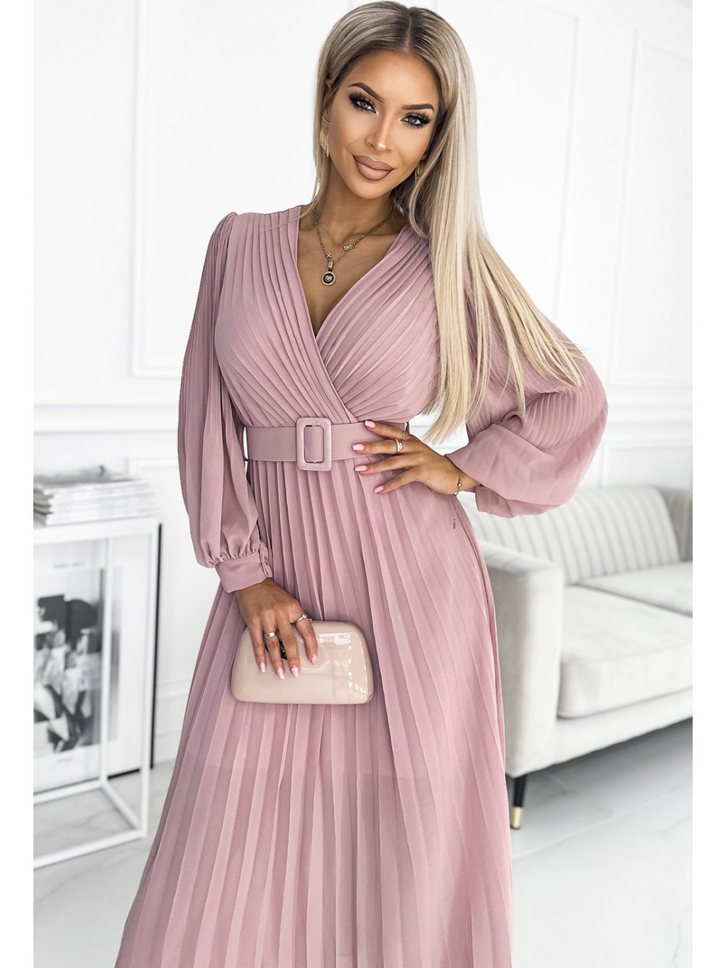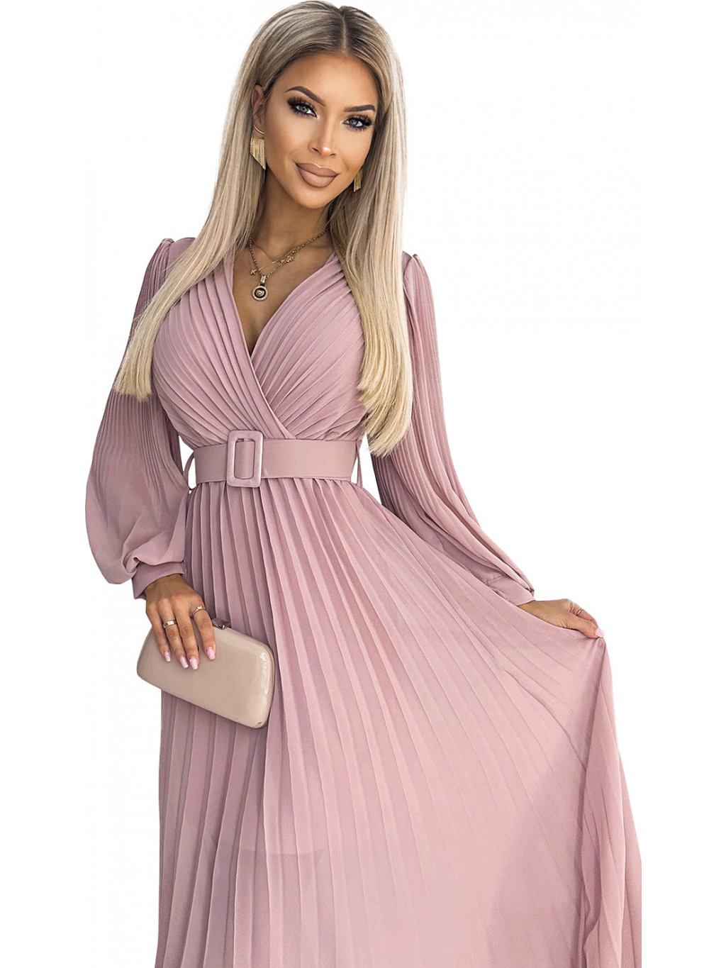 Skladané púdrové šifónové šaty s dlhými rukávmi a opaskom KLARA