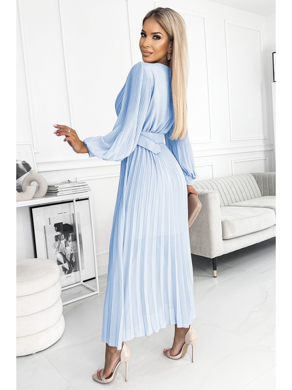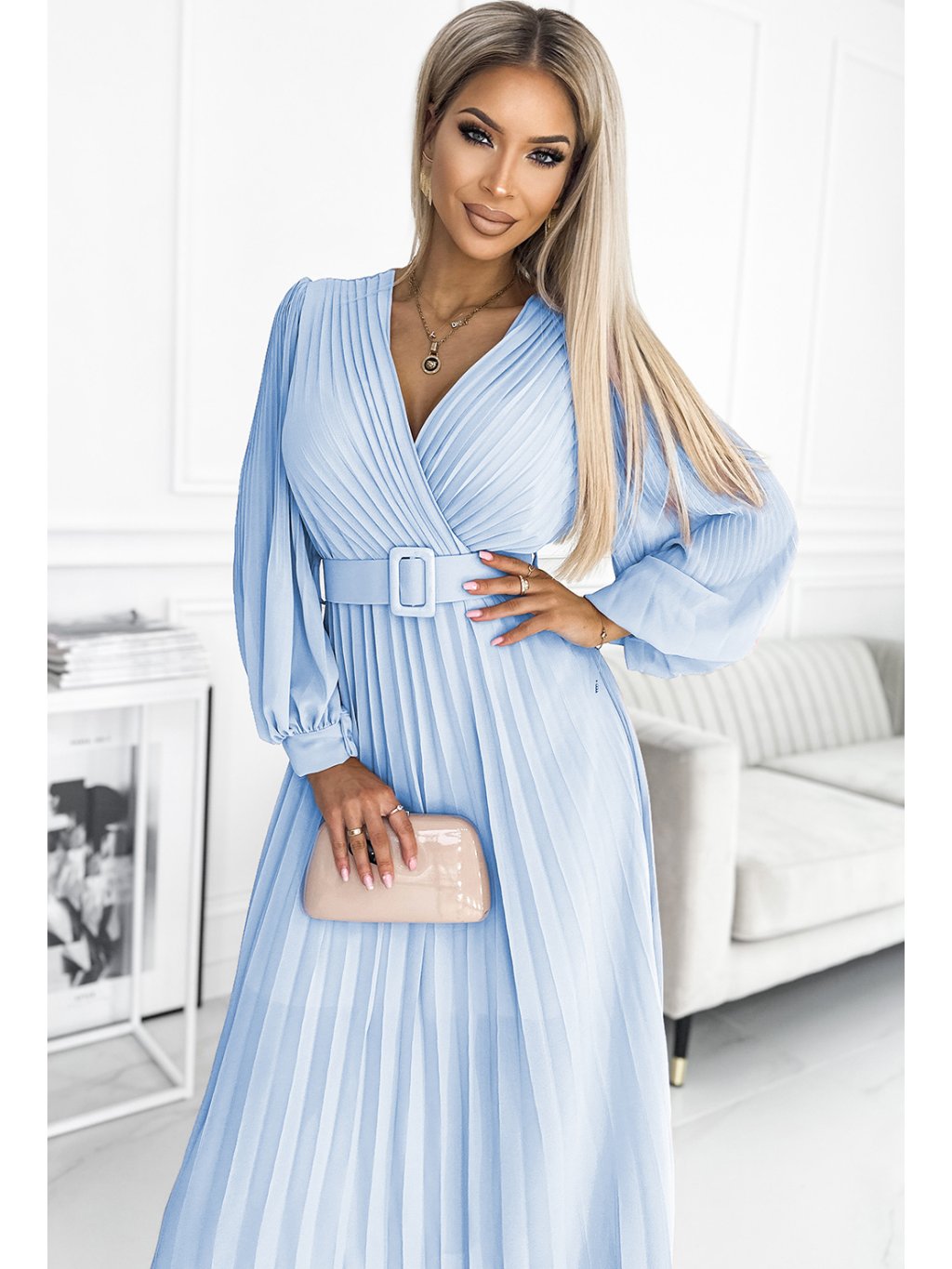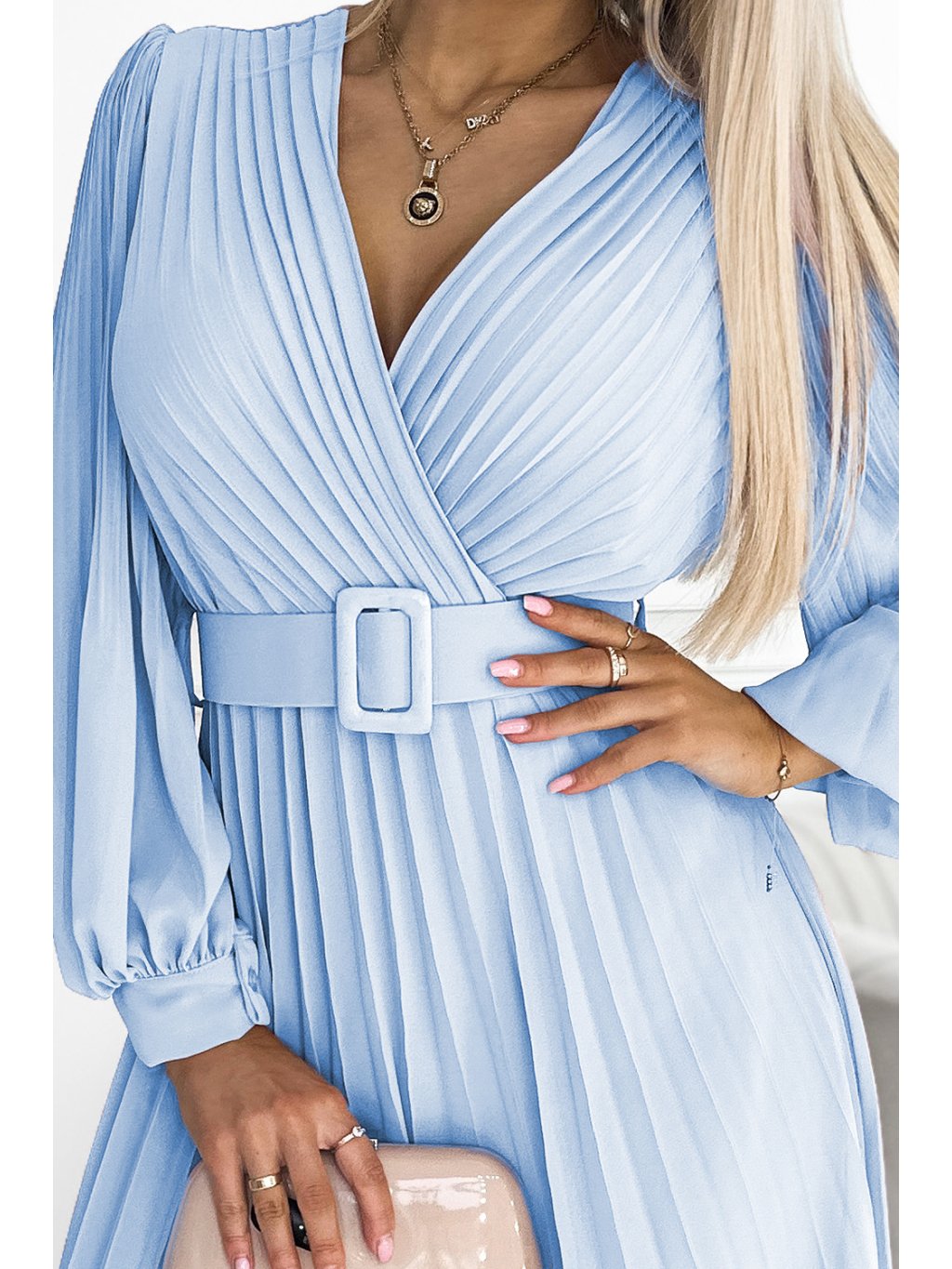 Skladané svetlo modré šifónové šaty s dlhými rukávmi a pásikom KLARA