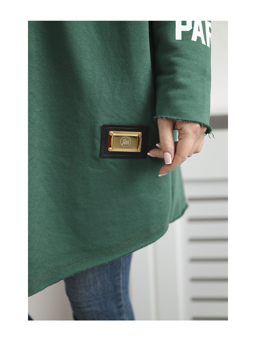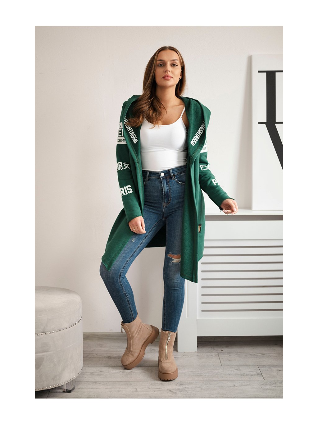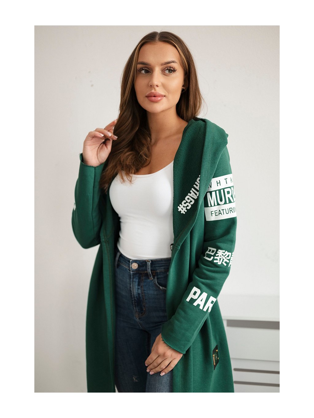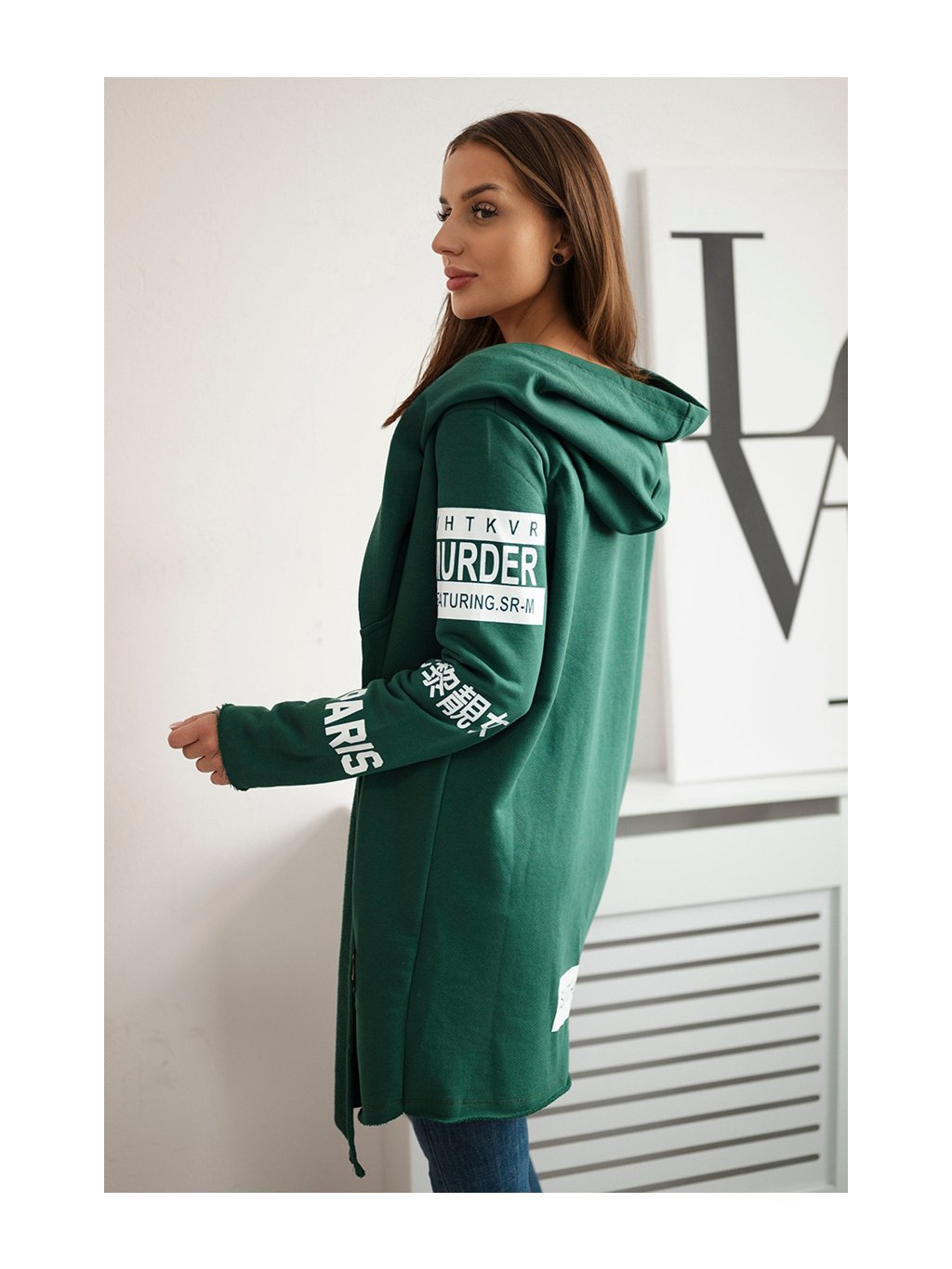Smaragdový dámsky kardigán s nápismi a kapucňou