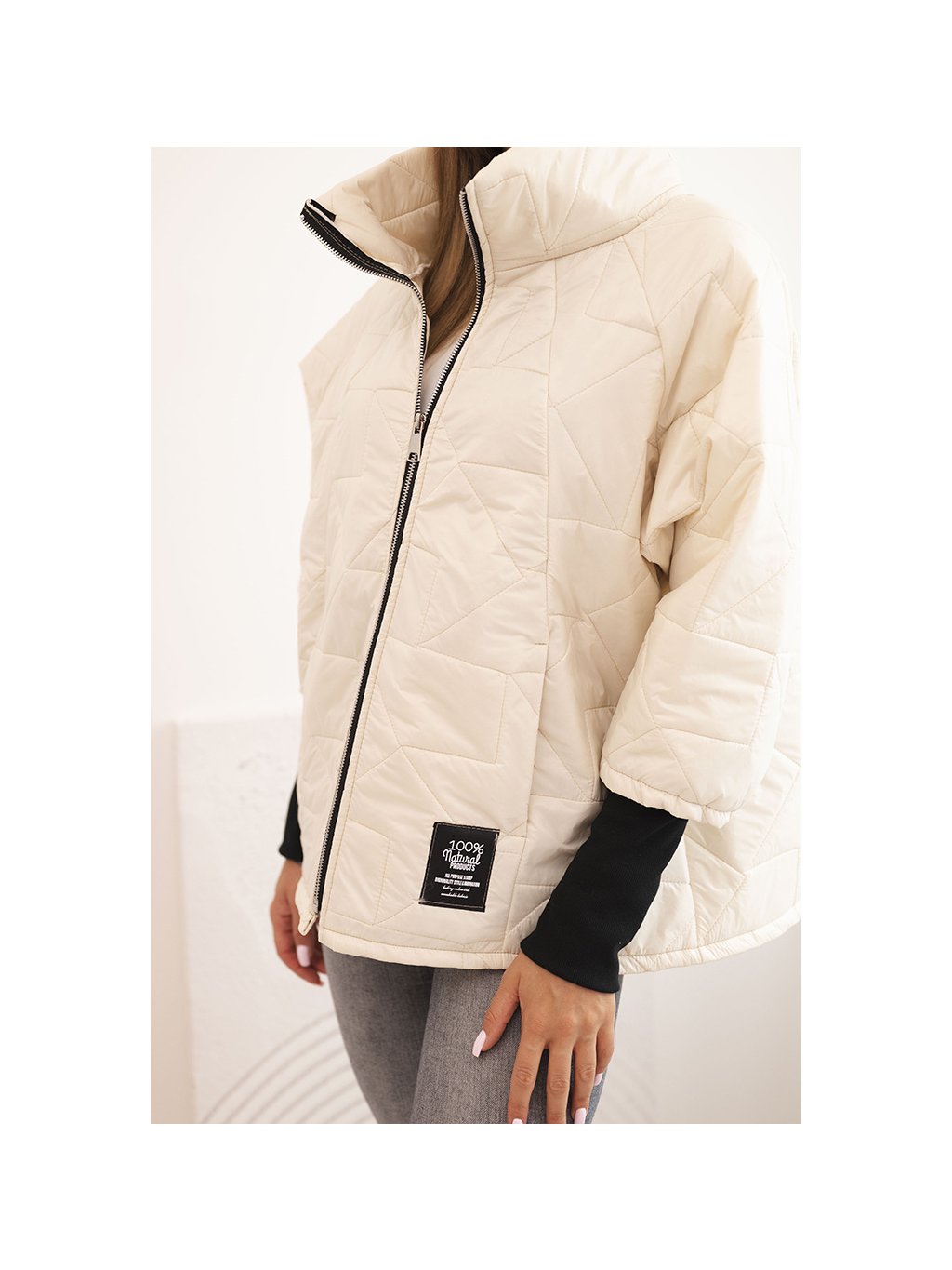 Smotanová dámska prešívaná bunda so stojačikom a elastickými manžetami