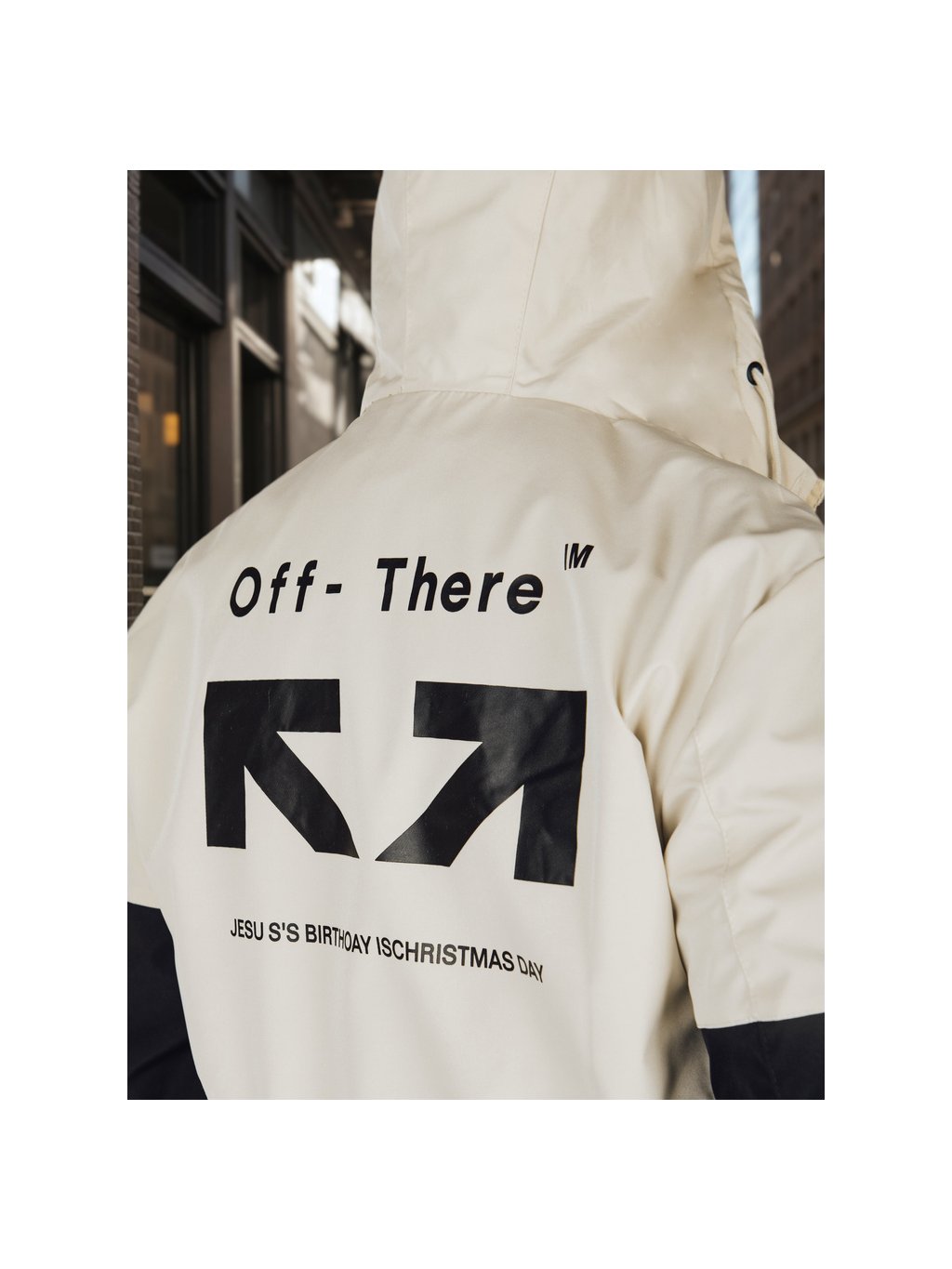 Smotanovo-čierna pánska prechodná bunda s kapucňou a potlačou