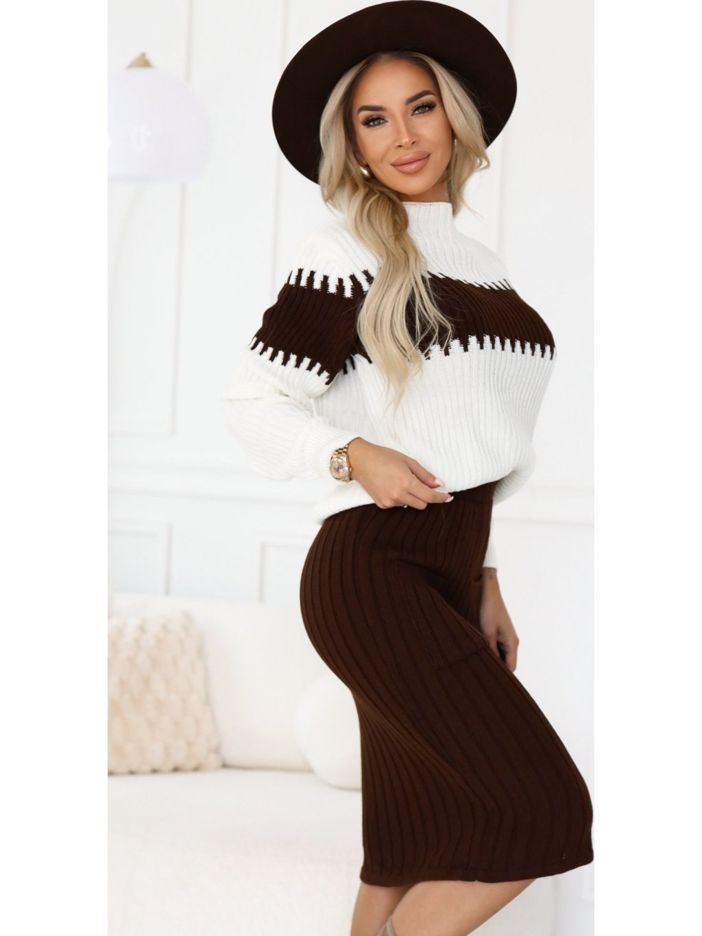 Smotanovo-hnedá súprava svetra a sukne